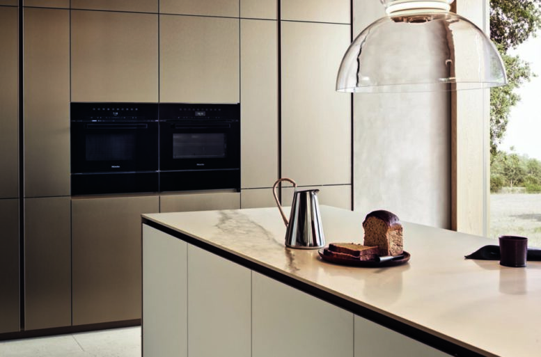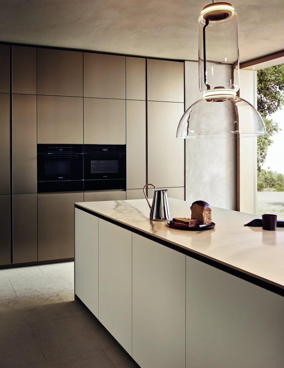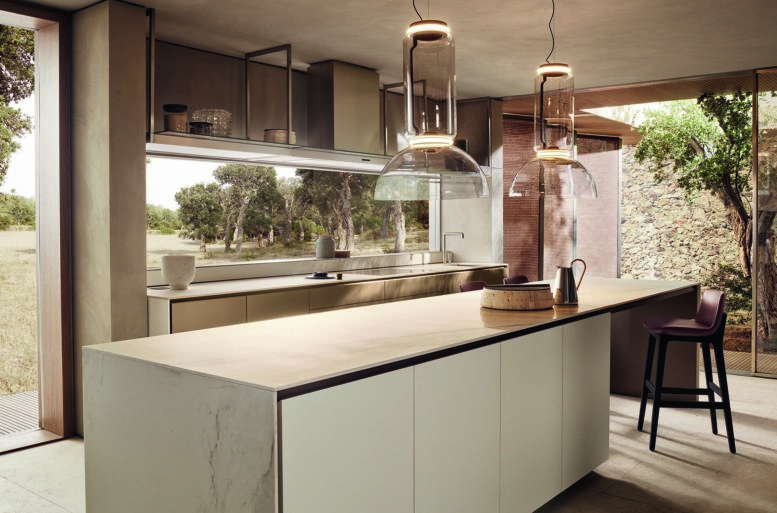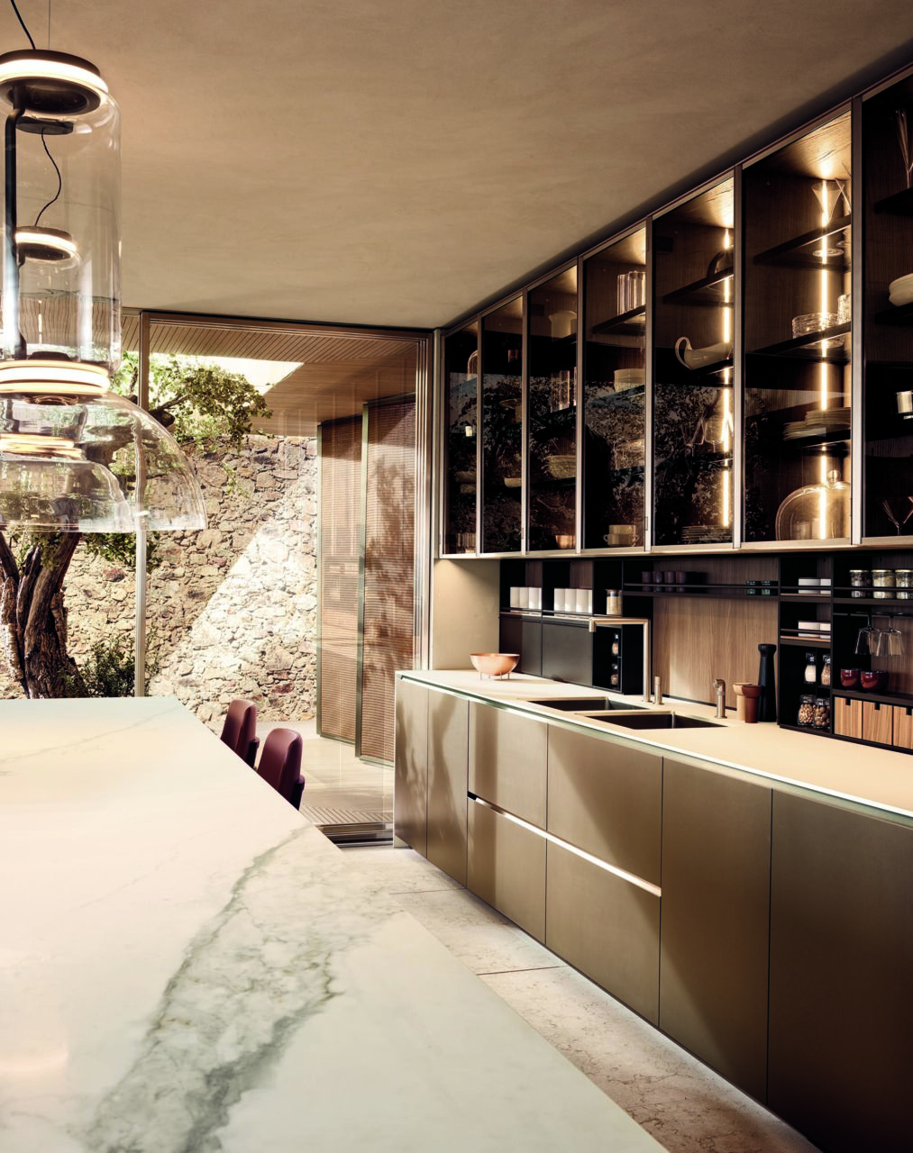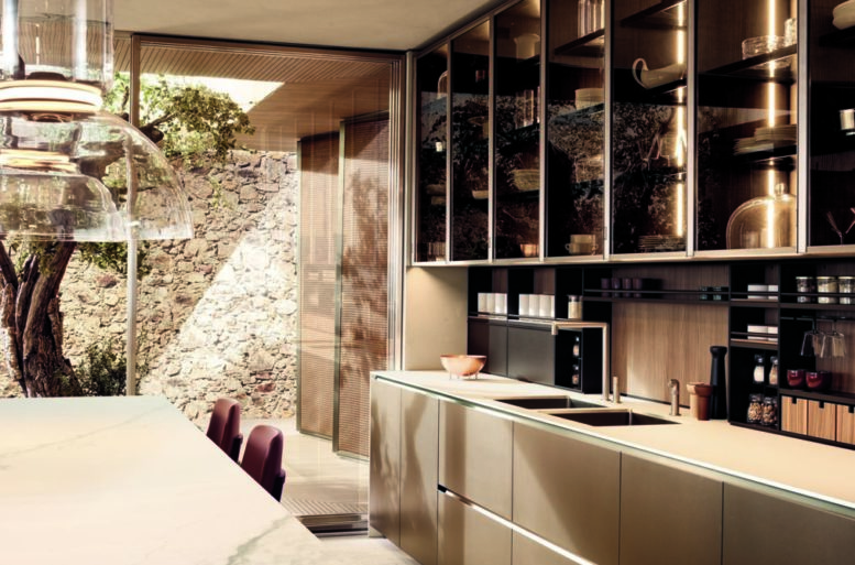 La nuova anta ha un bordo superiore rastremato a 55° ed è sormontata da un profilo maniglia coordinato con il colore della gola orizzontale. Il fianco della cucina, leggermente distanziato dall’anta, contribuisce a dare un senso di leggerezza alle basi. Sia i pensili che le colonne possono essere dotate di ante in vetro. La trasparenza e la riflessione del vetro, in un gioco tra pieni e vuoti, riverberano e moltiplicano lo spazio cucina.