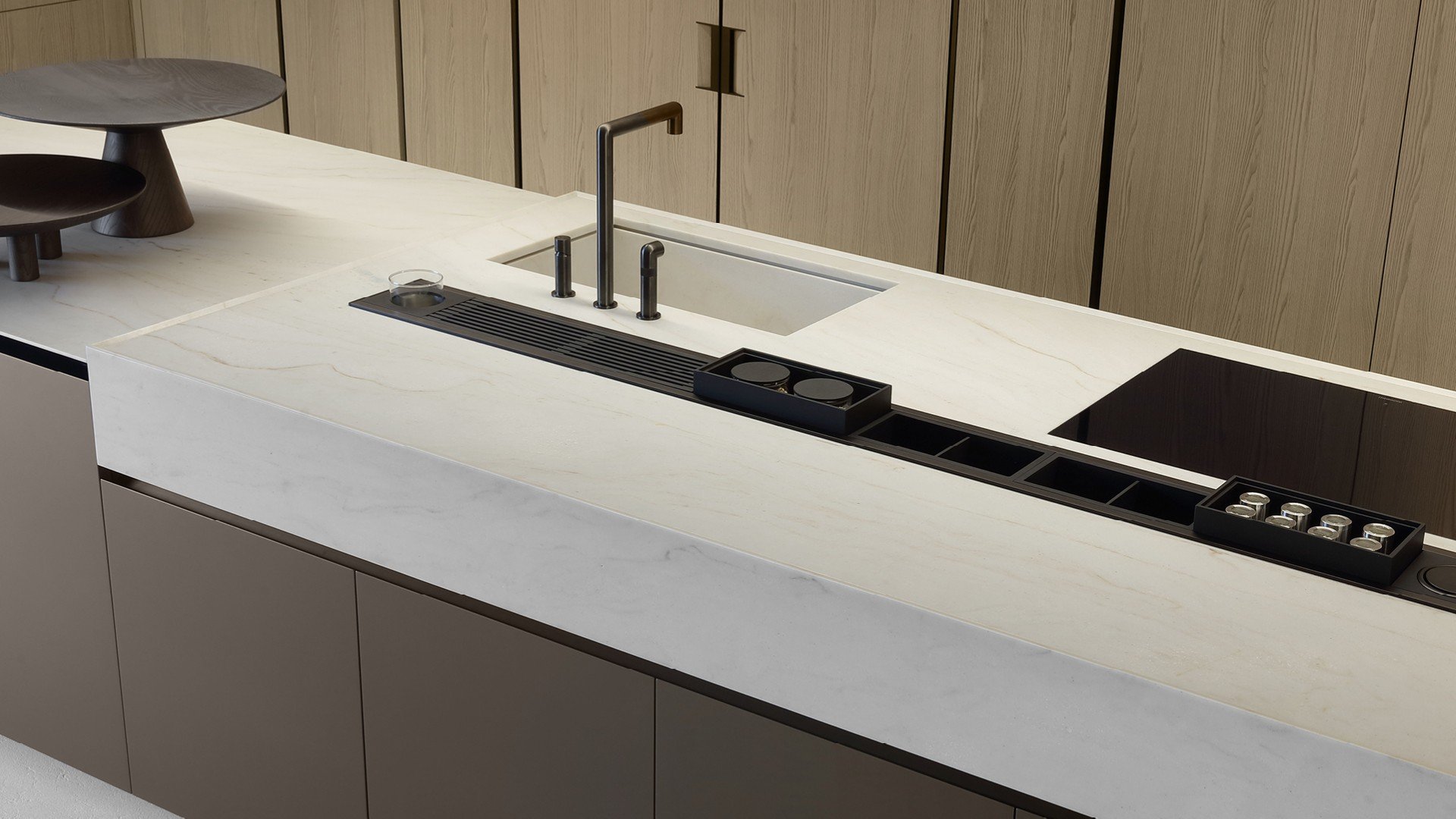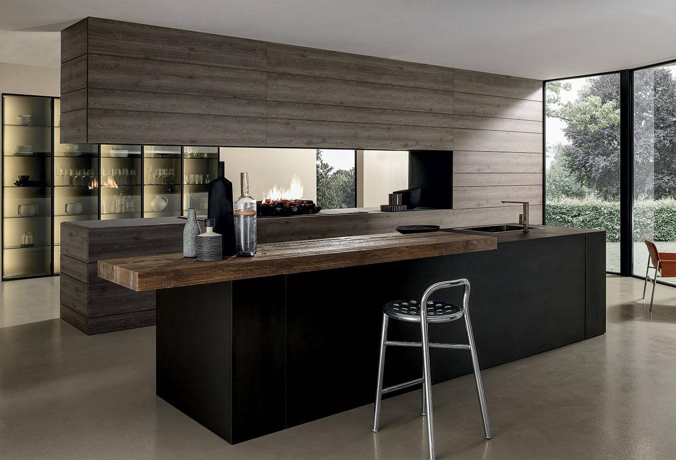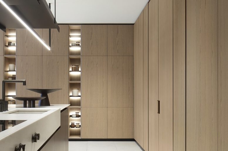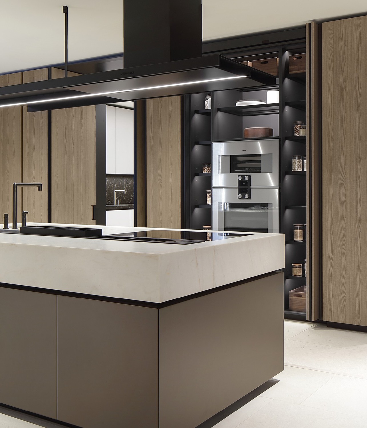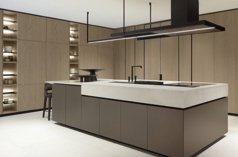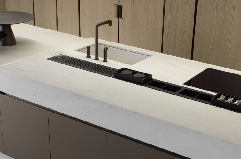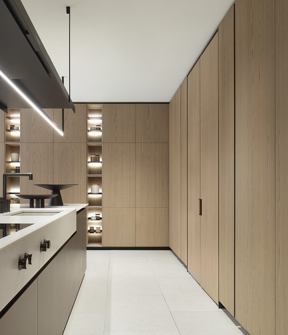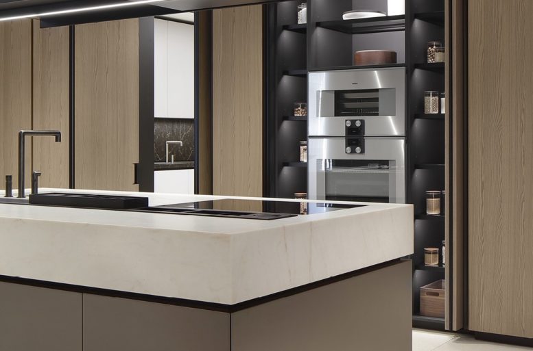La nuova Artex Pro si presenta in una configurazione ampia e raffinata, che abbina le nuove finiture metalliche all’essenza di rovere barrique, una tonalità chiara con sofisticate sfumature grigie, culminante nel top in quarzite naturale. Perfettamente integrata Sistemi Architectural e alle boiserie del sistema cucina, Artex Pro si propone come ambientazione domestica di grande ispirazione.