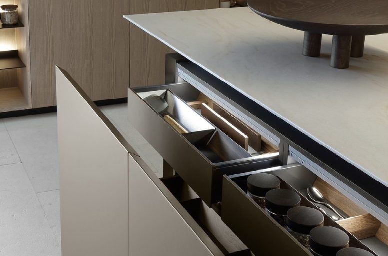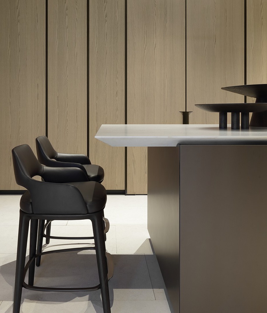 Il restyling di Artex Pro si rivela primariamente a partire dal piano cucina. Il nuovo sviluppo del top con una inedita inclinazione del bordo crea suggestivi giochi di luce e profondità, accentuati dalla presenza delle gole – elemento distintivo del sistema – che contribuisce a un effetto di estrema leggerezza visiva. L’introduzione di una nuova altezza del piano (da 18 cm) dona al progetto una presenza più scultorea, in particolare nella composizione a isola. È proprio l’isola a ospitare un’ulteriore innovazione: il piano snack a sbalzo, che conferisce dinamismo al volume e continuità visiva tra la zona operativa e quella conviviale.