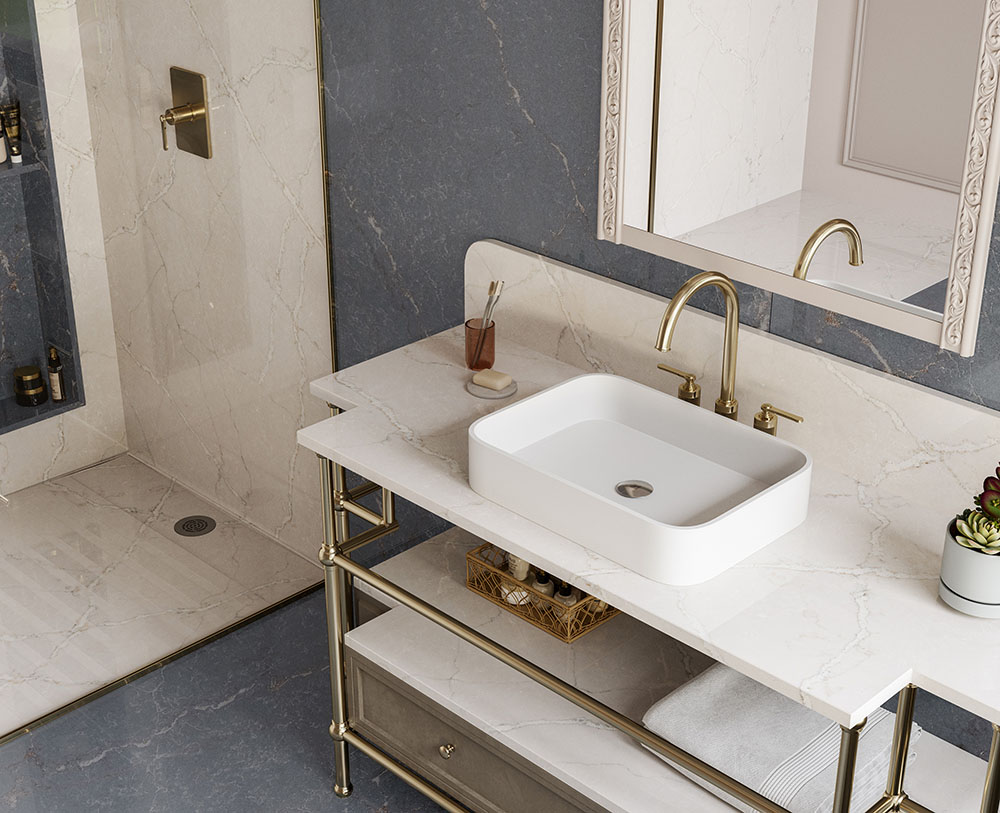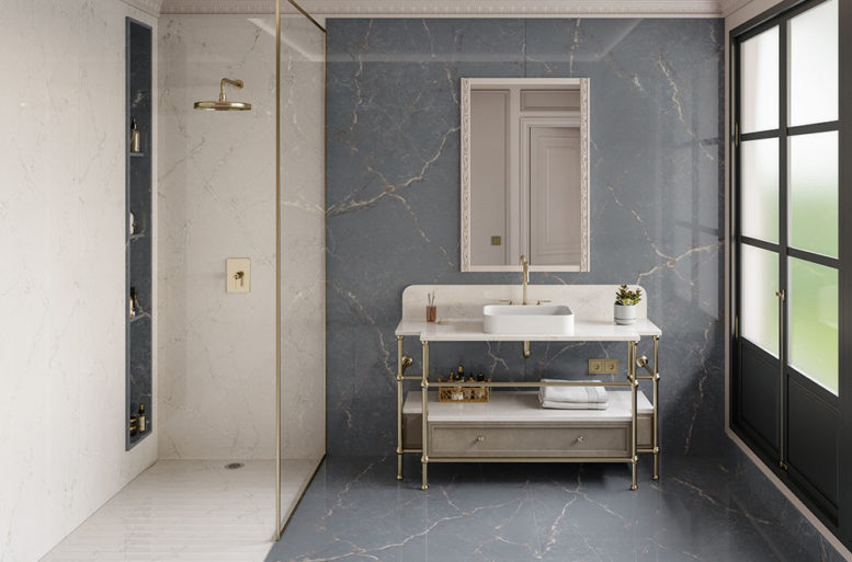 La collezione, ispirata al fascino degli spazi vittoriani, con contaminazioni dal mood parigino, recupera la bellezza ed eleganza delle superfici venate marmoree.