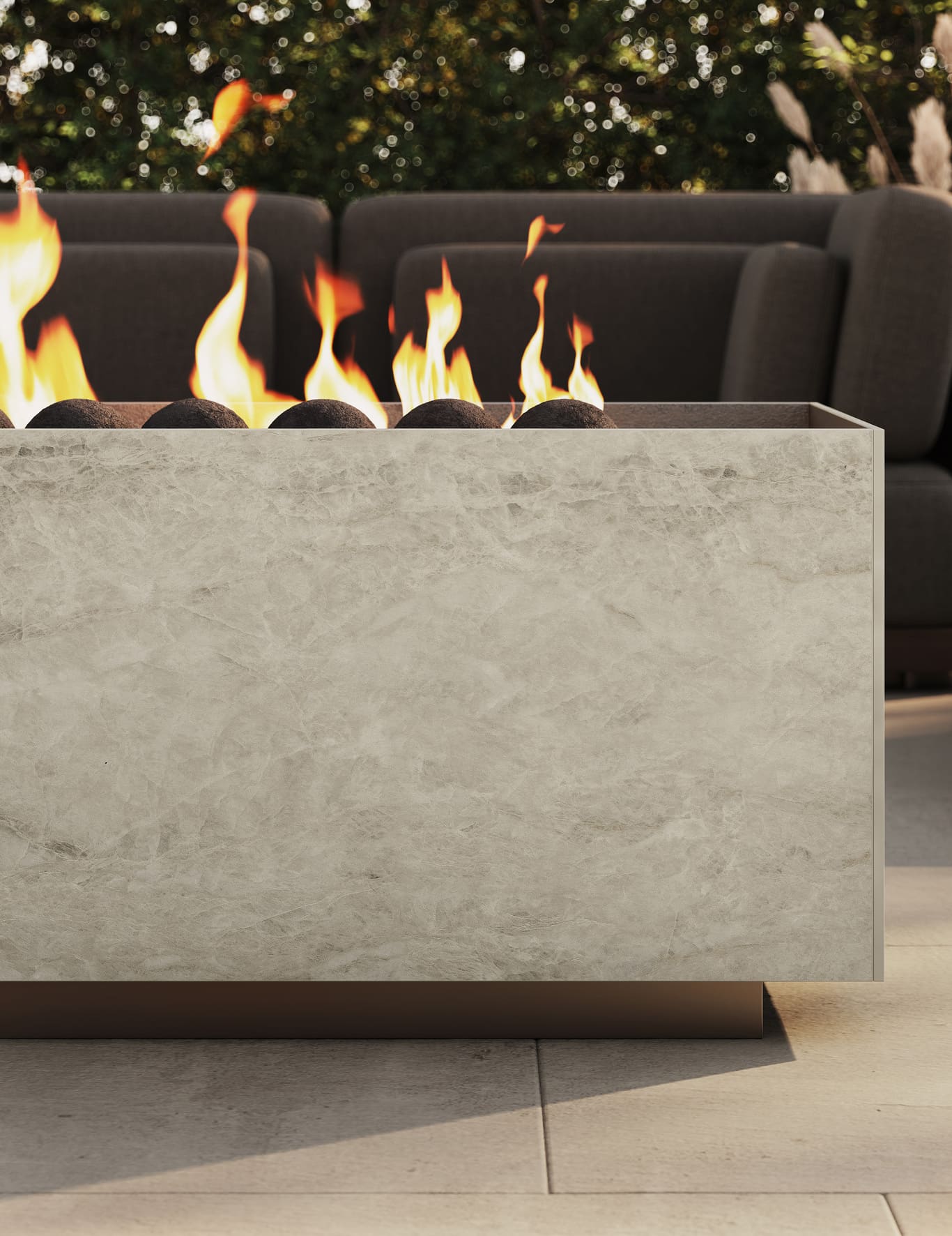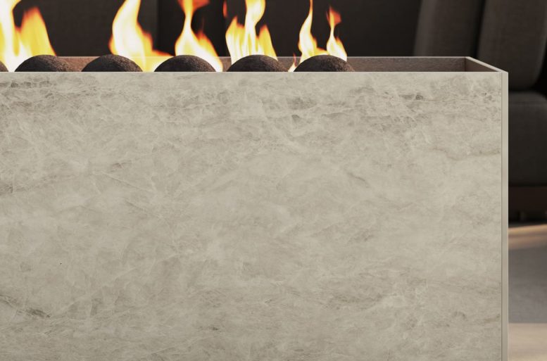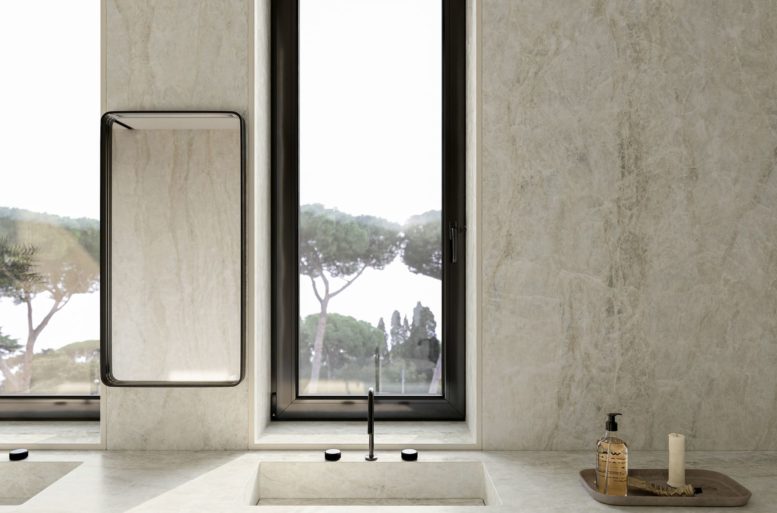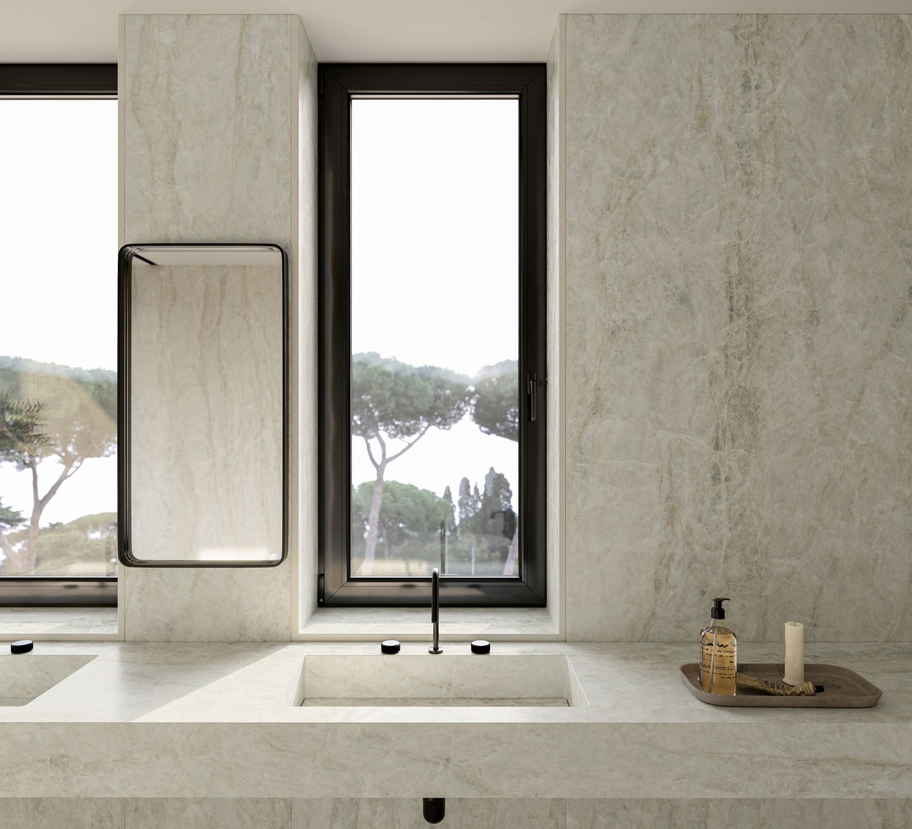 Each surface in the range is inspired by marbles, quartzites, granites, and metamorphic stones — such as Port Laurent, Gris Pulpis, and the marbles Calacatta Lincoln, Calacatta Gold, Carrara, and Statuario — reinterpreted through cutting-edge technology.