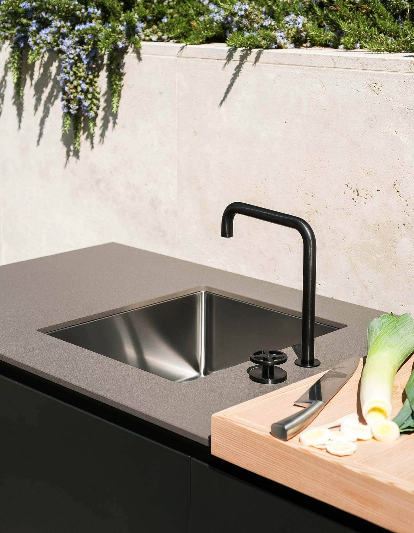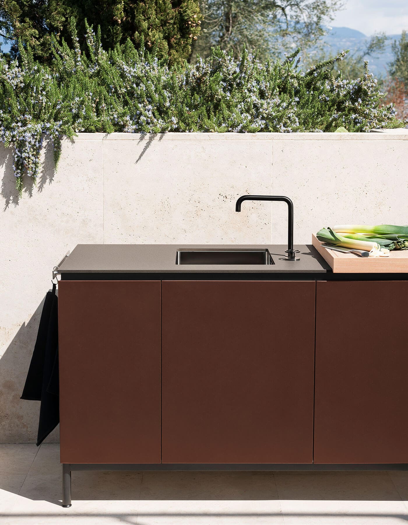 The freestanding island in RODA’s signature smoke color, with doors also available in rust and milk shades, features a stainless steel AISI 304 sink set into a durable Lapitec® countertop, with three large storage compartments below.