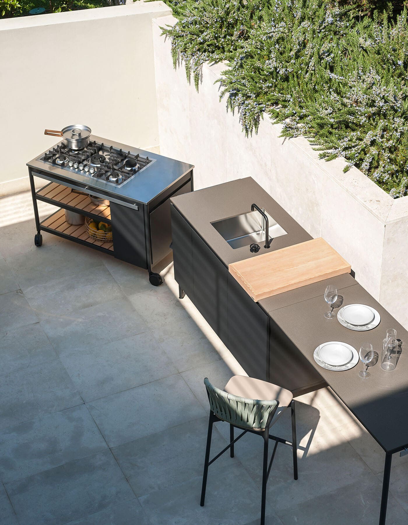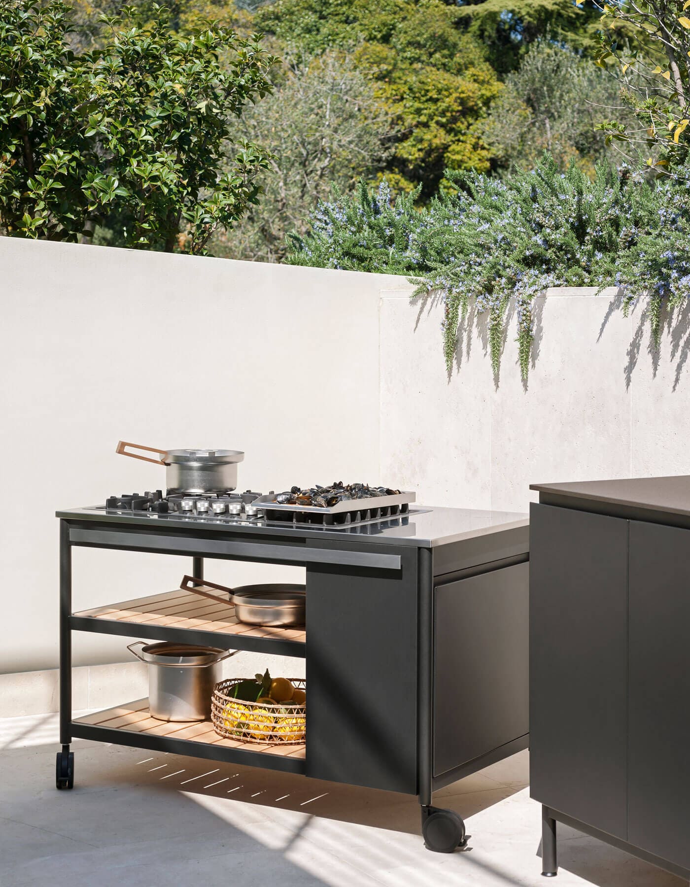 The five-burner gas cooktop — with a central dual-ring burner with Dual technology, two small front burners, and two medium rear burners — and the barbecue module — equipped with three grills and a cooking lid — operate independently from the other units. Both are available with fixed legs or wheels, allowing them to be moved freely and stored under the peninsula’s work area when needed.