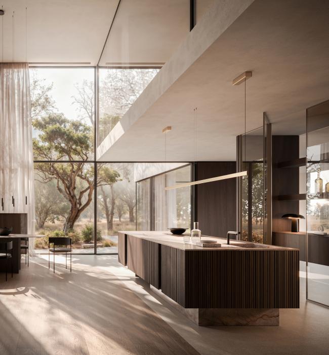 The grooved Walnut Moka door from the Groove collection integrates perfectly with the stone base, enhancing the fluidity of the space. A true innovation is the Vertical opening system: the handleless door extends 5 cm outward and conceals an integrated LED light that highlights volumes and materials. An innovative solution that redefines kitchen design, introducing an entirely new aesthetic language.