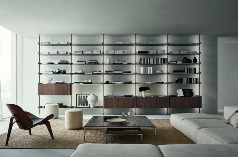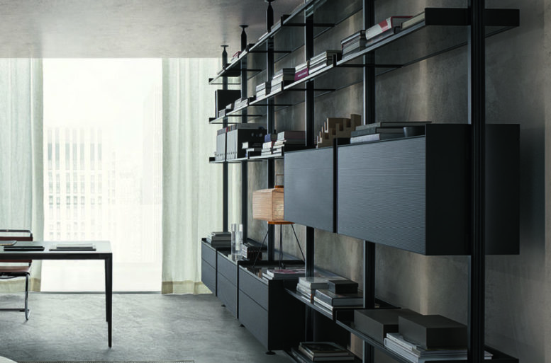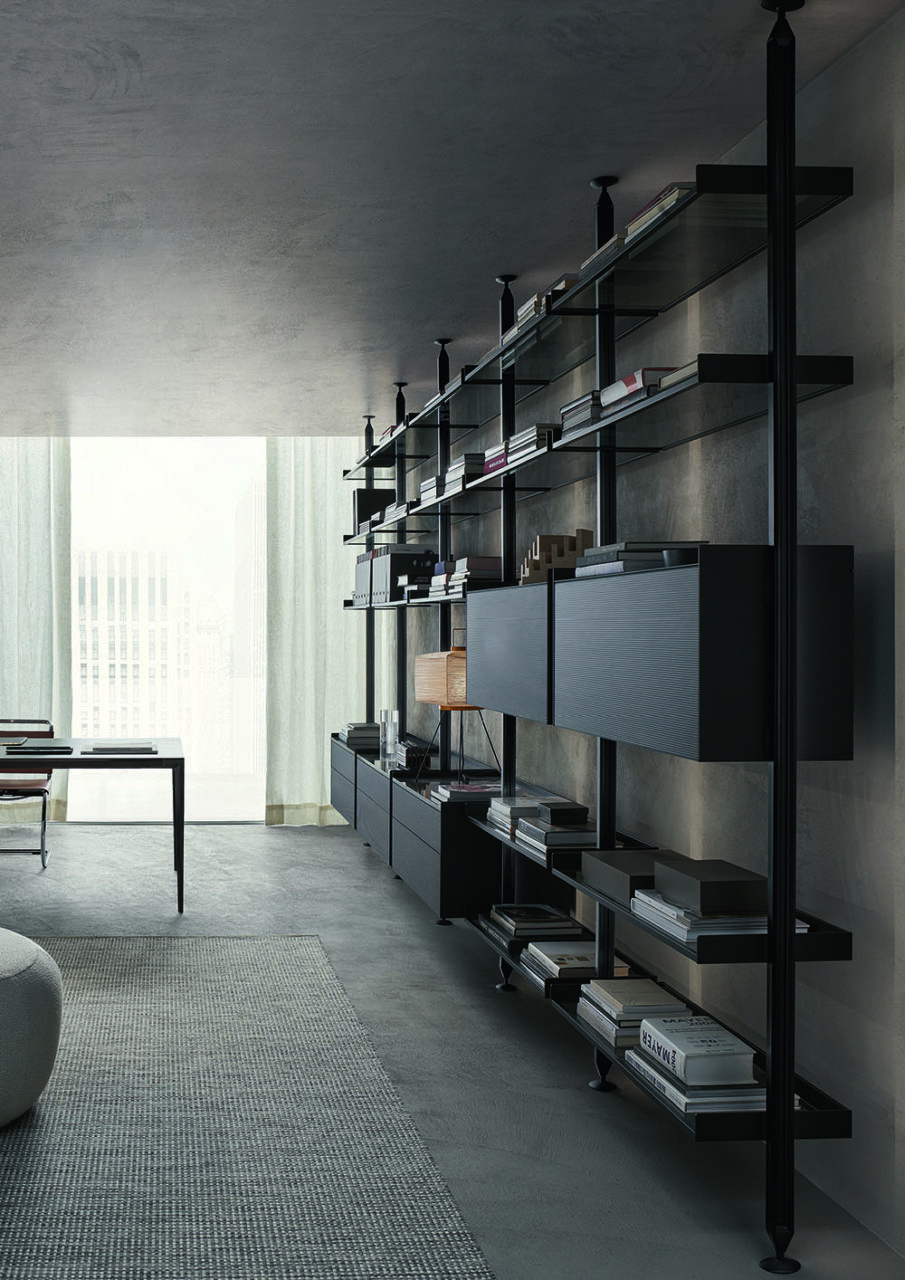 With Zenit, Rimadesio has introduced important innovations in the typology of the “upright bookcase”. These include the exclusive coupling system which guarantees the open modularity of the elements and the production of an aluminum upright without any holes or predefined connections. The uprights, fixed from the ground to the ceiling and always made to measure, allow a free arrangement of the equipment, with the possibility of moving or integrating them over time.
