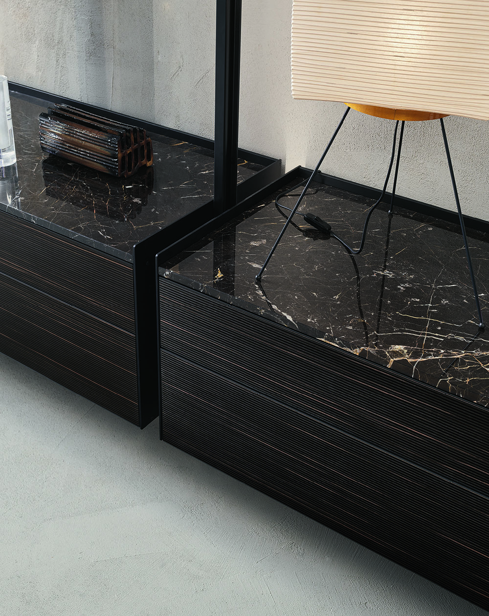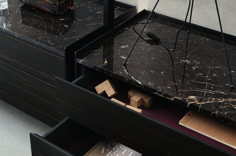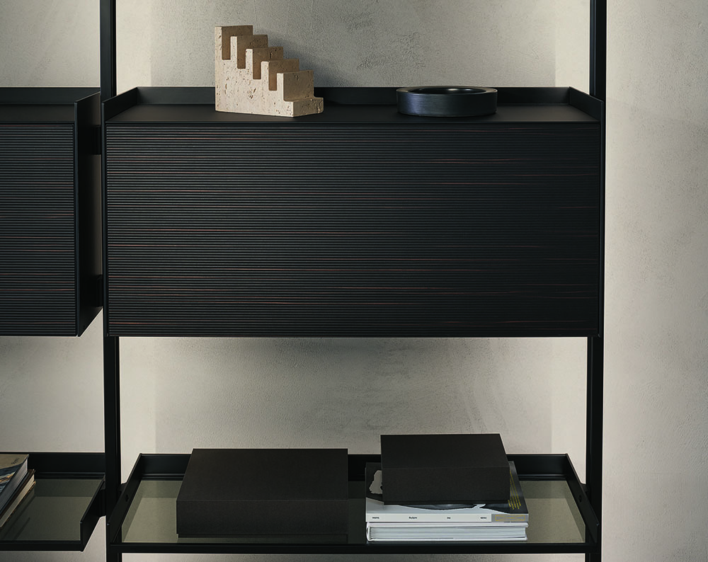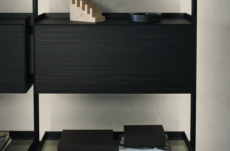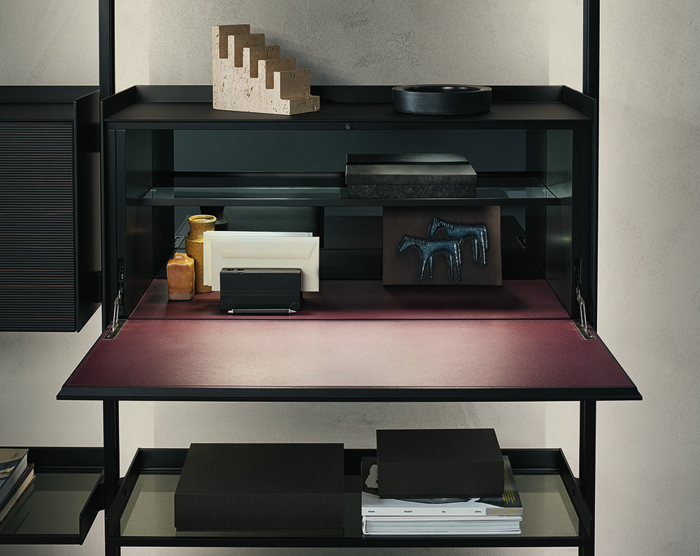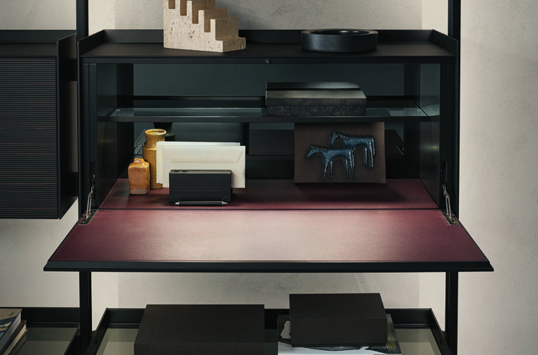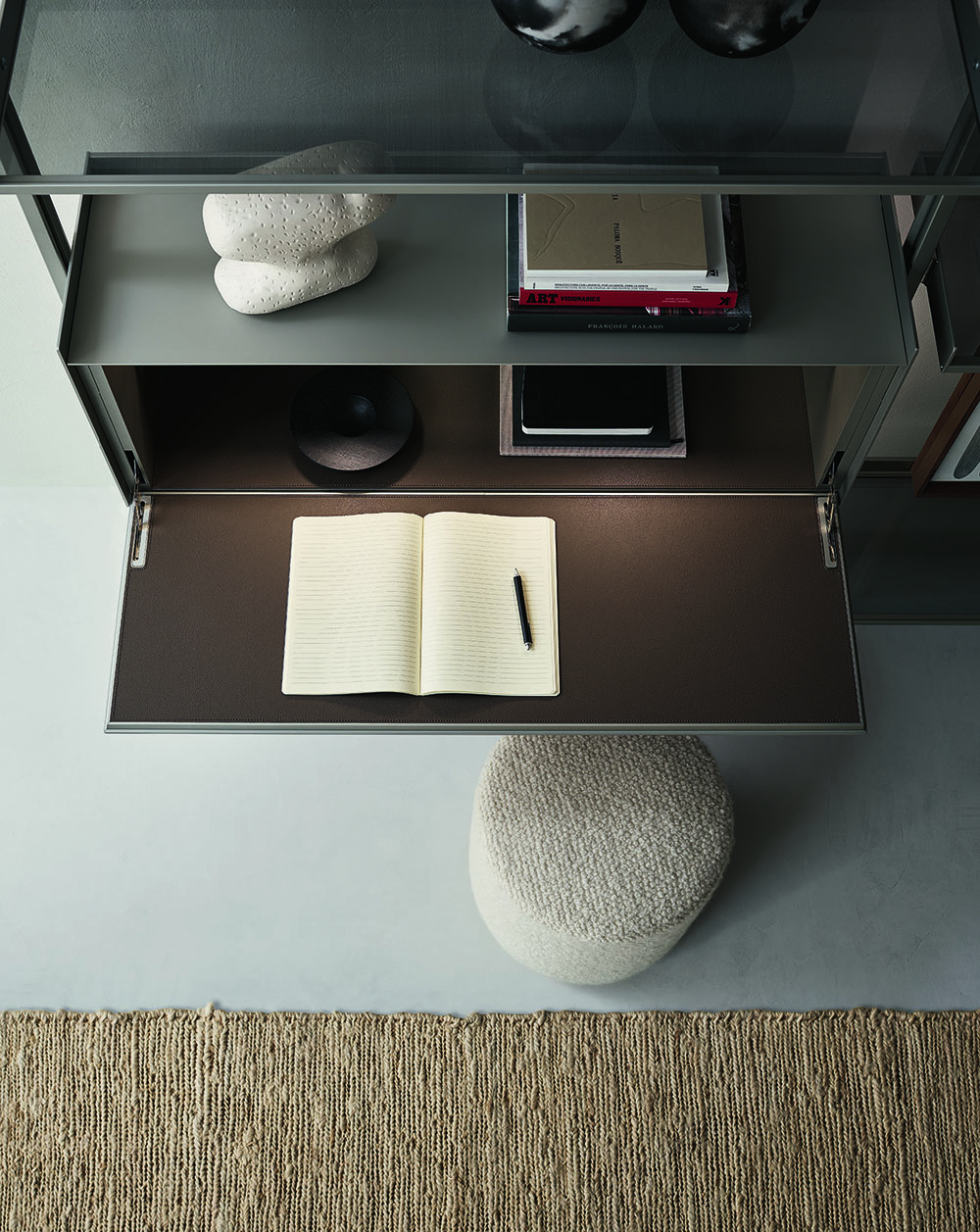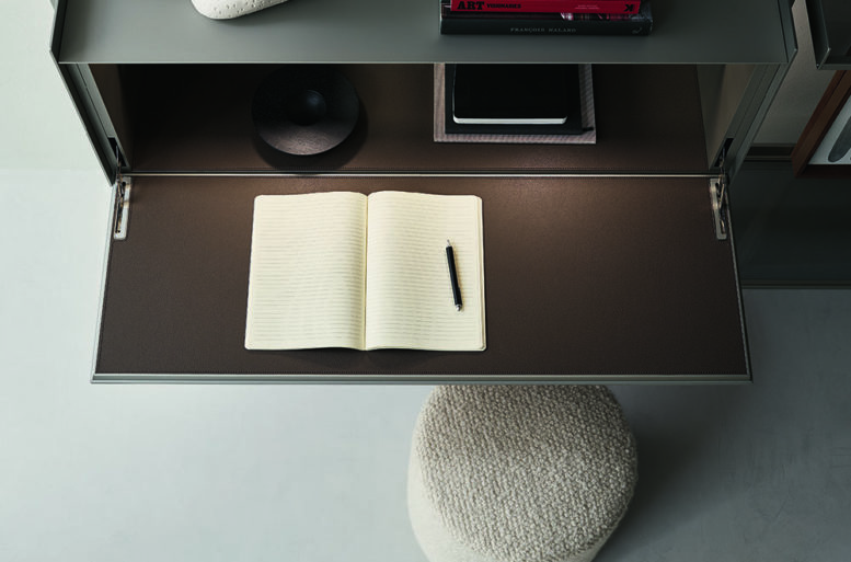 The new cabinets, equipped with aluminum profiles and lateral sides, are available in the aluminum finish, brown and in the 48 Ecolorsystem variants. The double-sided coating of the drawers and doors is available in lucido, opaco, reflex, sahara and diamante lacquered glass or in Litech, in Sahara and Taiga wood with a three-dimensional effect, in fabric in the Lux and Material range and also in synthetic leather, with a total of 161 finishes. The writing desk unit with a flap door is internally lined with synthetic leather in the 7 available finishes.