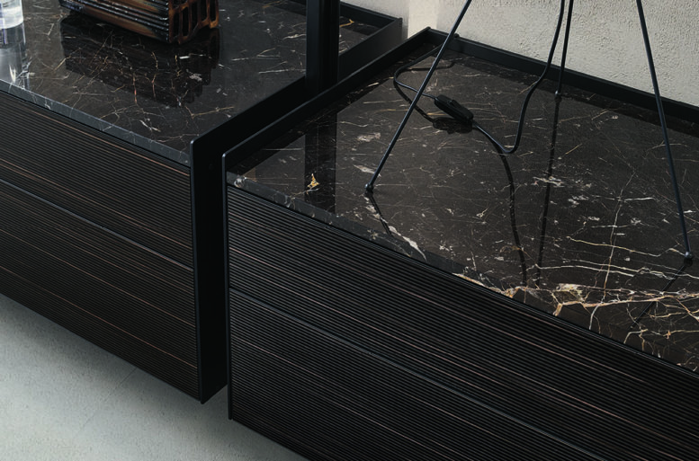 The new aluminum drawers, with fully extractable runners, are equipped with an unprecedented push opening system and cushioned soft close.