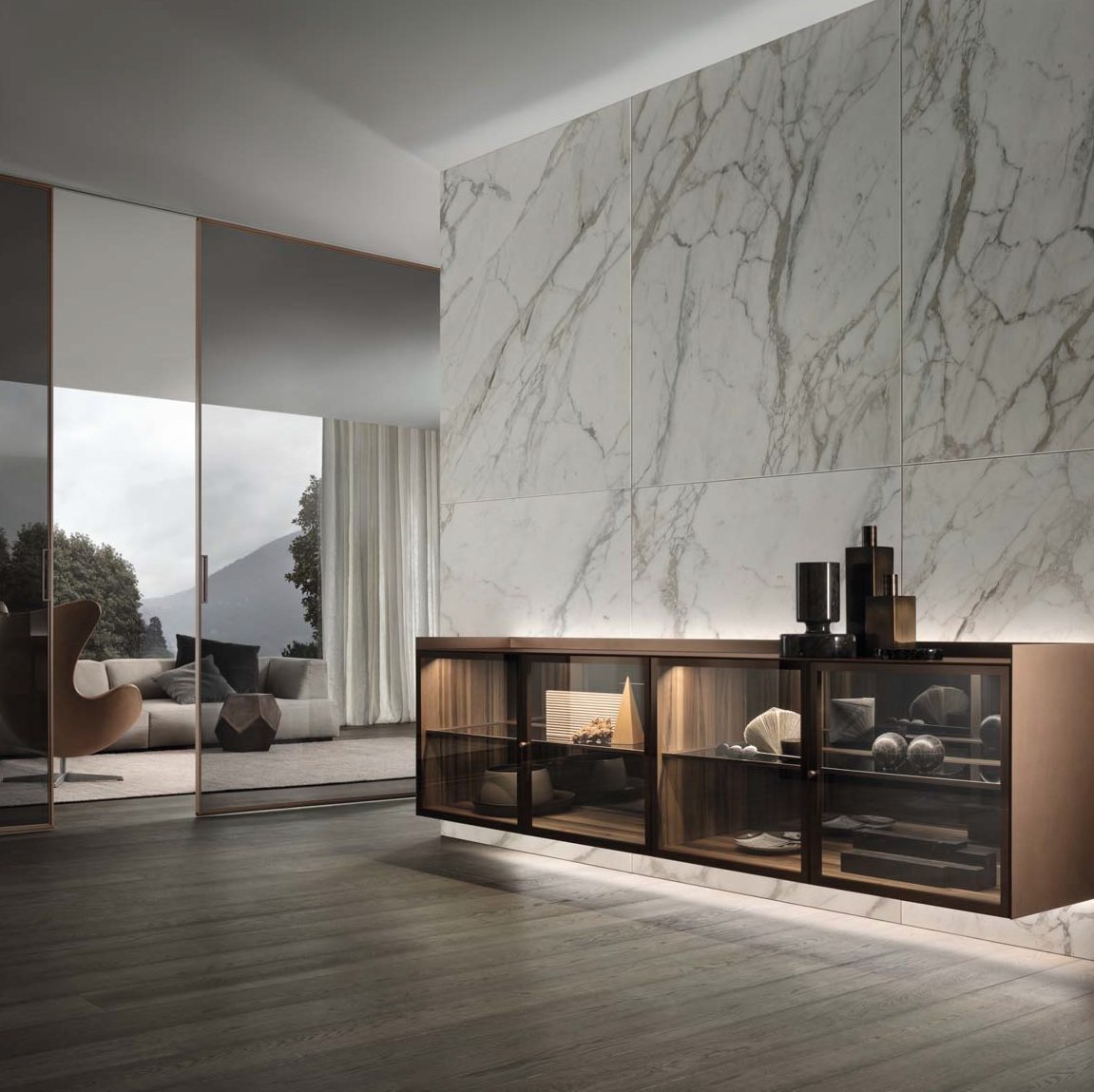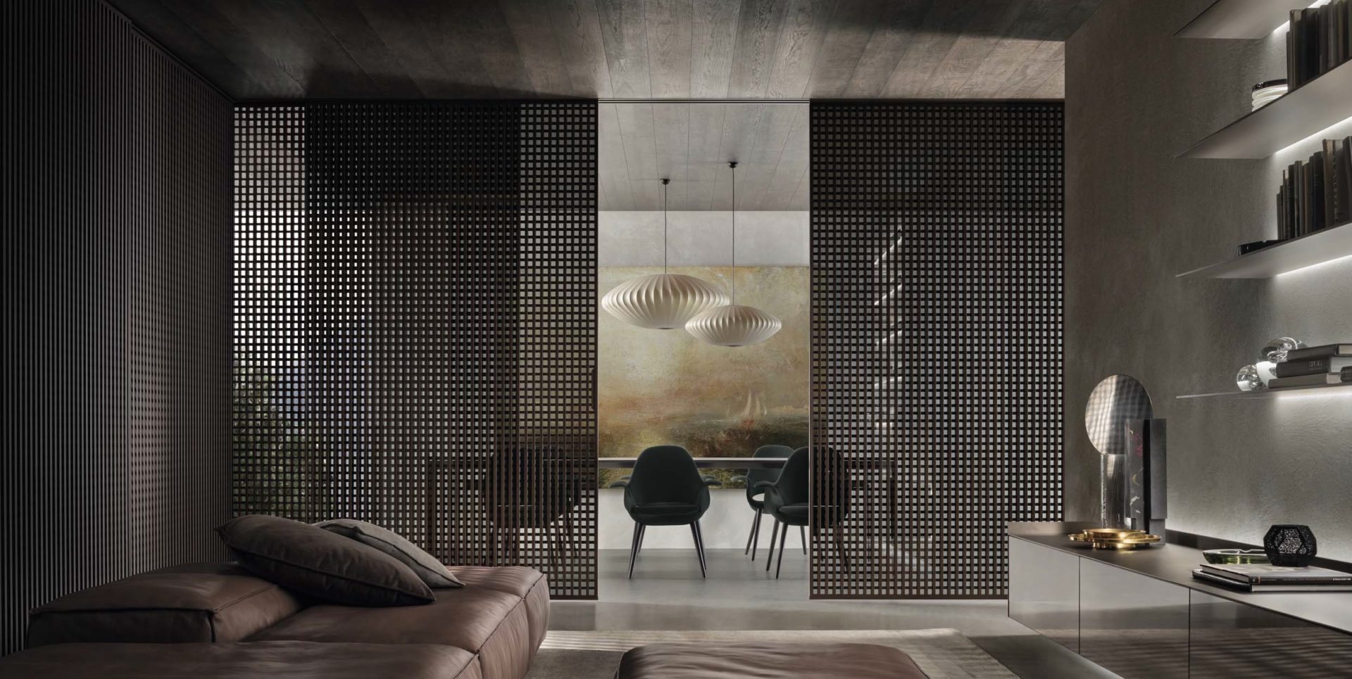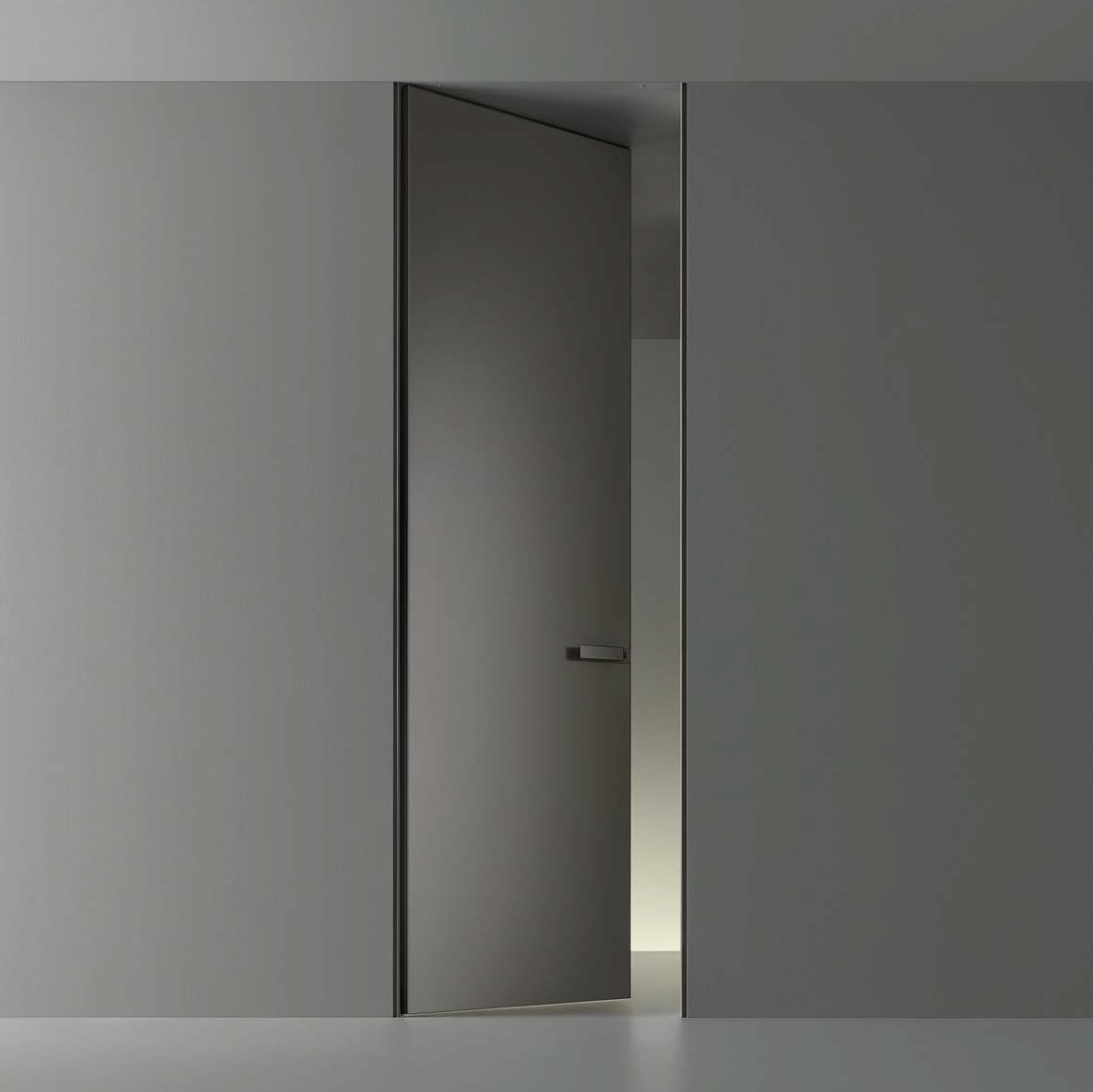 perfettamente mimetica, che è estesa ai nuovi binari e ai vari componenti meccanici, e gli innovativi profili di copertura dei binari stessi, disponibili nelle medesime finiture dell’anta o predisposti per una verniciatura in loco uniforme al soffitto. Nella foto la nuova porta scorrevole Daimon, con un’estetica di grande fascino evocativo, con struttura alluminio brown e binario brevettato ad incasso in estruso di alluminio, in tinta con la struttura delle porte scorrevoli. Vetro trasparente
