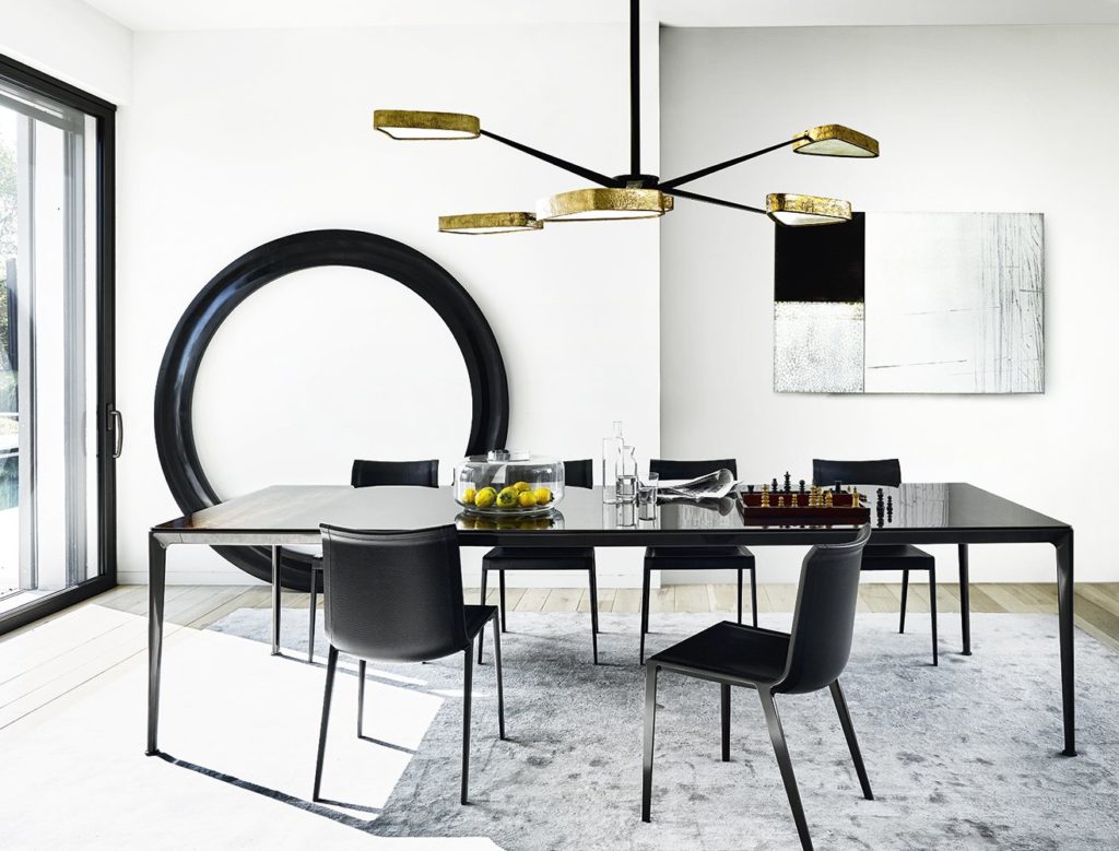L’eleganza del nero è il principale tema della soluzione d’arredo, che alterna forme morbide e naturali, come il divano in pelle con struttura in acciaio, o il pouf e la poltrona sagomati, a forme lineari e spigolose, come la credenza specchiata della zona pranzo o il tavolino in marmo del soggiorno.