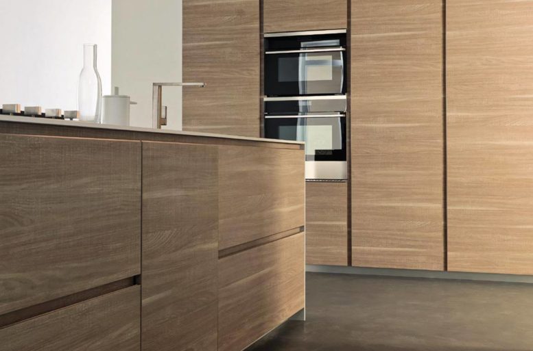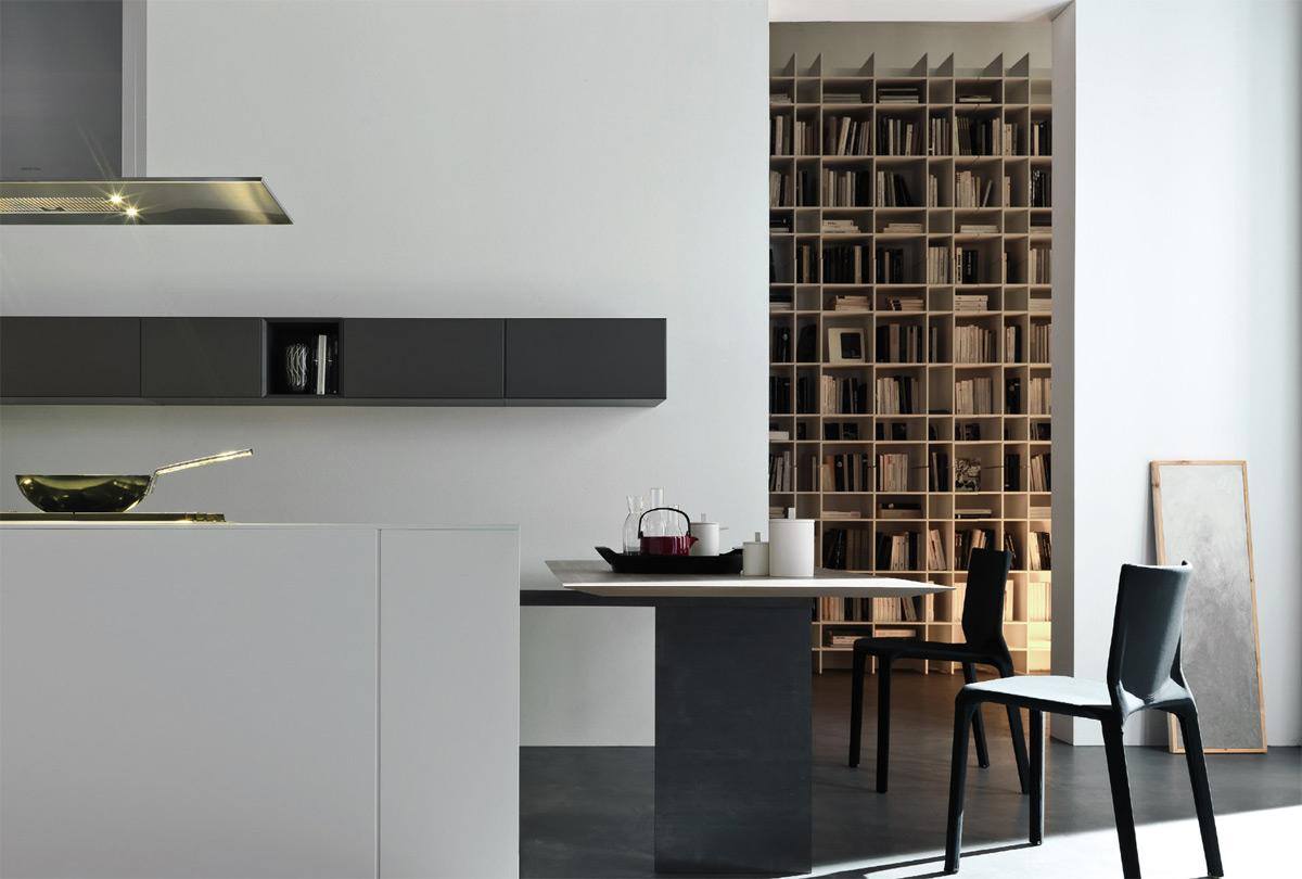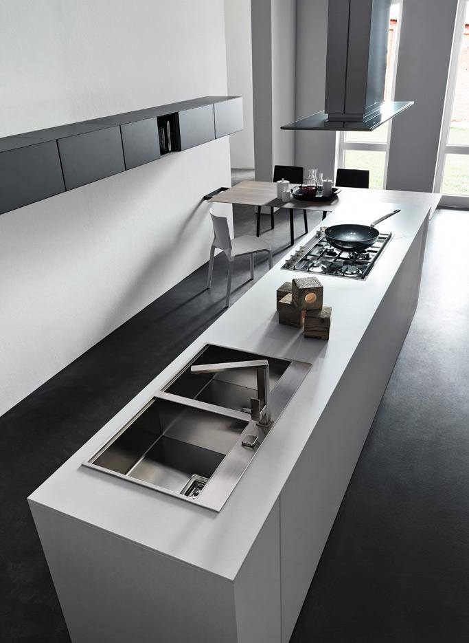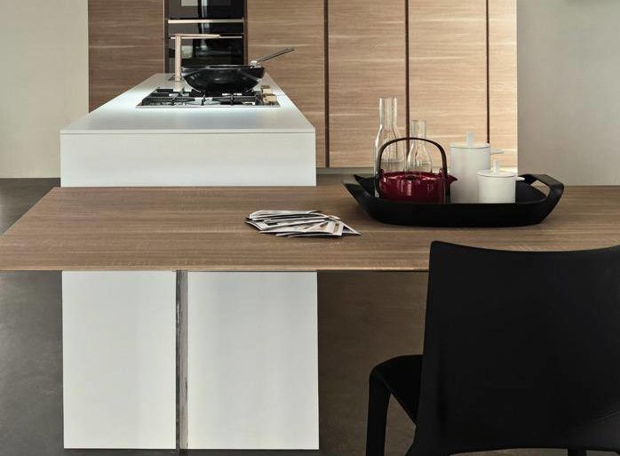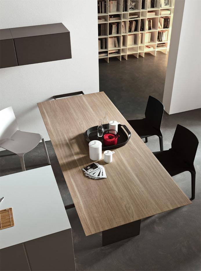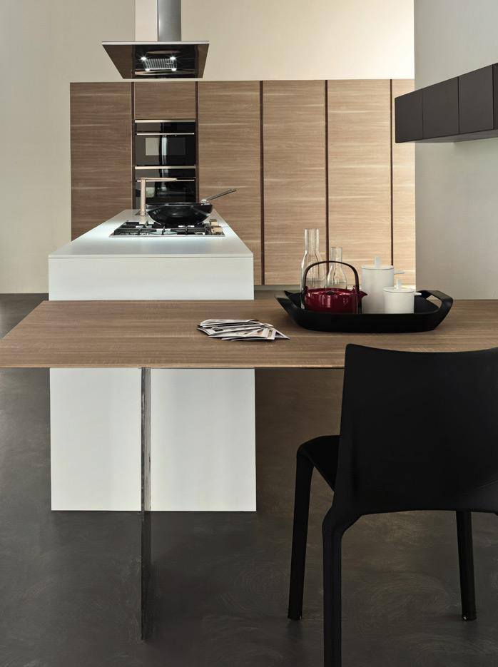 L’ architettura di questa cucine Modulnova è costituita da linee e forme semplificate e lascia  all’utente finale la possibilità di personalizzare l’ambiente  rendendo la composizione  assolutamente unica. Le colonne sospese sono combinate con basi penisola di Rovere collegata ad un tavolo per il pranzo e la colazione di tutti i giorni.