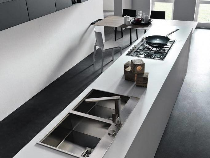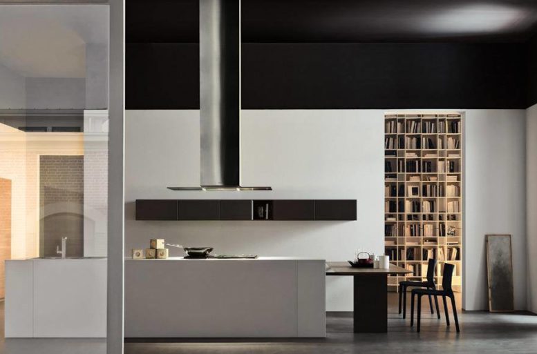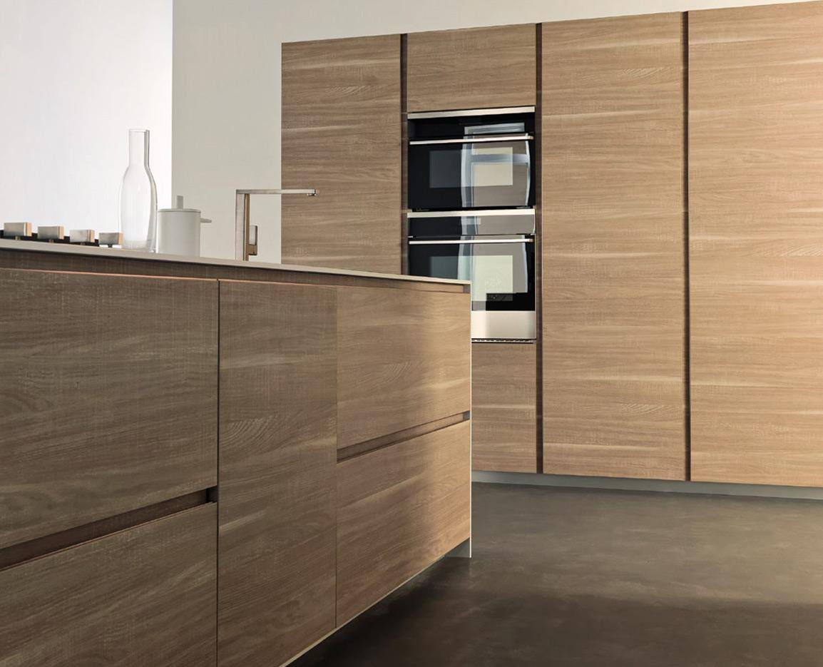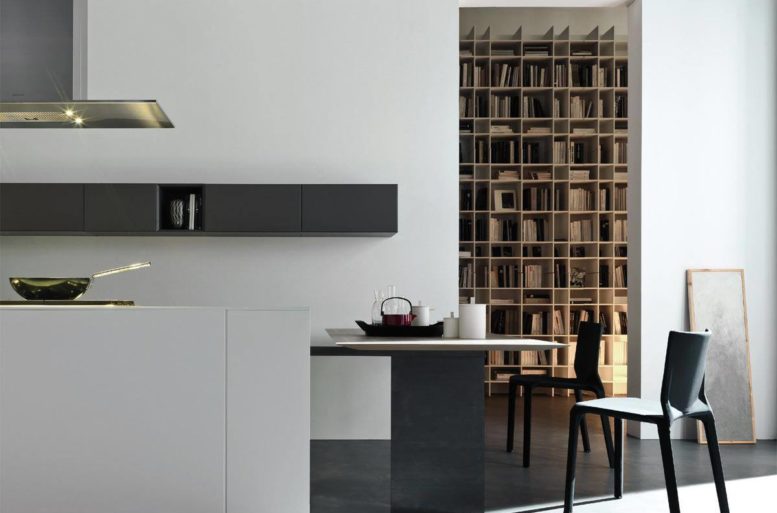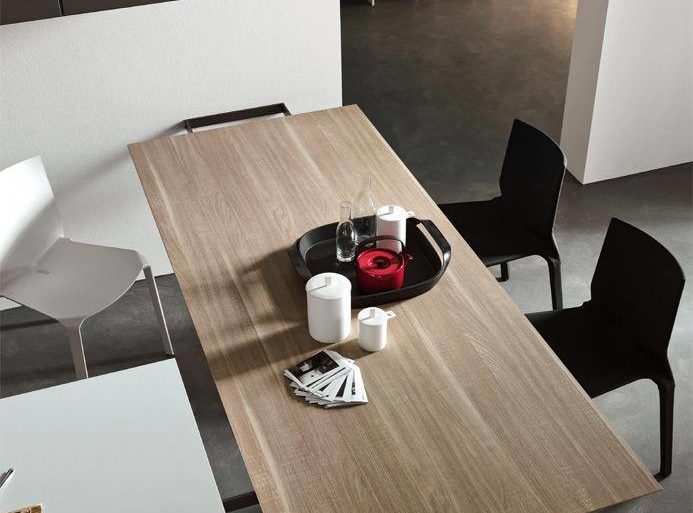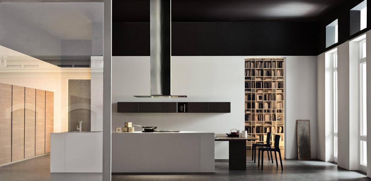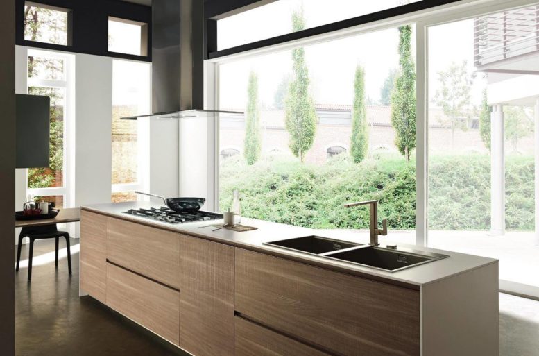L’ architettura di questa cucine Modulnova è costituita da linee e forme semplificate e lascia  all’utente finale la possibilità di personalizzare l’ambiente  rendendo la composizione  assolutamente unica. Le colonne sospese sono combinate con basi penisola di Rovere collegata ad un tavolo per il pranzo e la colazione di tutti i giorni.