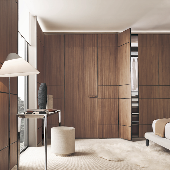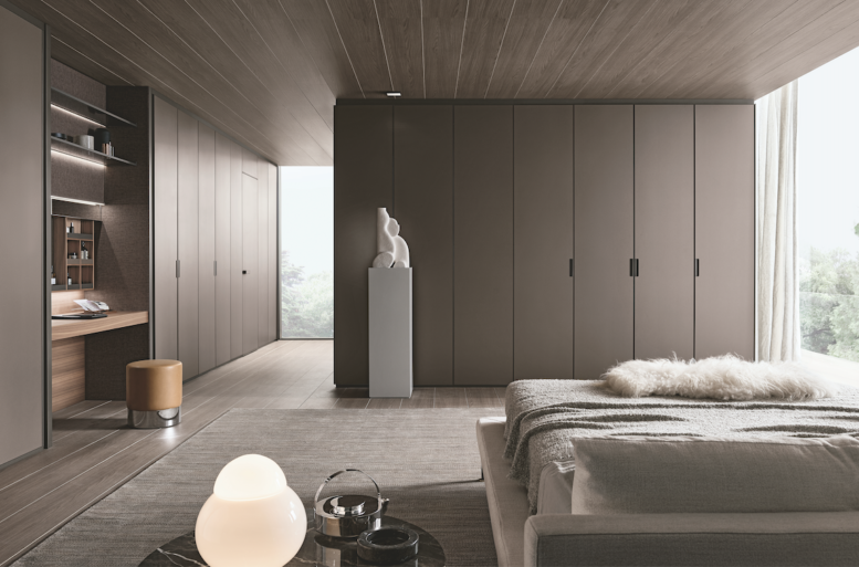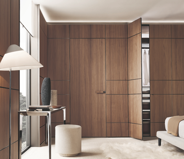 La boisierie Modulor da quest’anno svolge tre funzioni: definire lo stile dell’ambiente circostante, contenere ed esporre. Per la sua nuova funzione storage, Modulor è stata arricchita con vani attrezzati personalizzabili con aste portabiti, mensole, cassettiere, portapantaloni, e quindi declinabili per l’area giorno, l’ambiente living e la zona notte. I vani, come anche la nuova anta battente del sistema Modulor, si integrano perfettamente nella pannellatura a effetto continuo della boisierie.