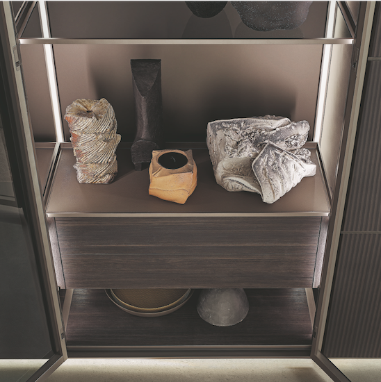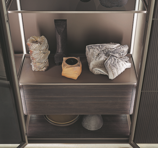 Per valorizzare oggetti d’affezione, invece, con Modulor è possibile creare sofisticate vetrine liberamente posizionabili grazie al sistema brevettato che permette di fissare cassettiere sospese, mensole in vetro o legno, ripiani portabottiglie e vassoi estraibili rivestiti in similpelle. La ciliegina sulla torta è il sistema di illuminazione led, incassato nei profili orizzontali e disponibili anche a sensore. Il tutto ovviamente completamente su misura, con libera scelta di disposizione delle misure, delle attrezzature e della tipologia.