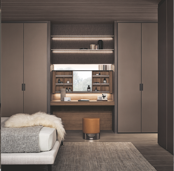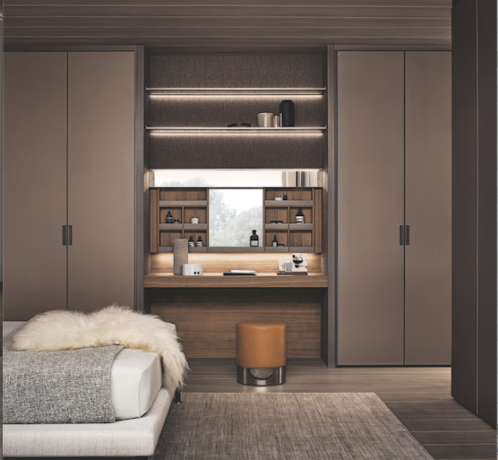 Vanity è un pratico e prezioso angolo privato dedicato alla cura di sé, pensato per custodire preziosità e cosmesi. Prevede un piano d’appoggio in essenza e una composizione di vani portaoggetti occultabile grazie a un’anta rivestita a specchio e dotata di movimento sali-scendi. Il tutto è completato da due ripiani superiori in vetro, la specchiera interna e un sistema led opzionale pensato per risaltare i volumi e le superfici.