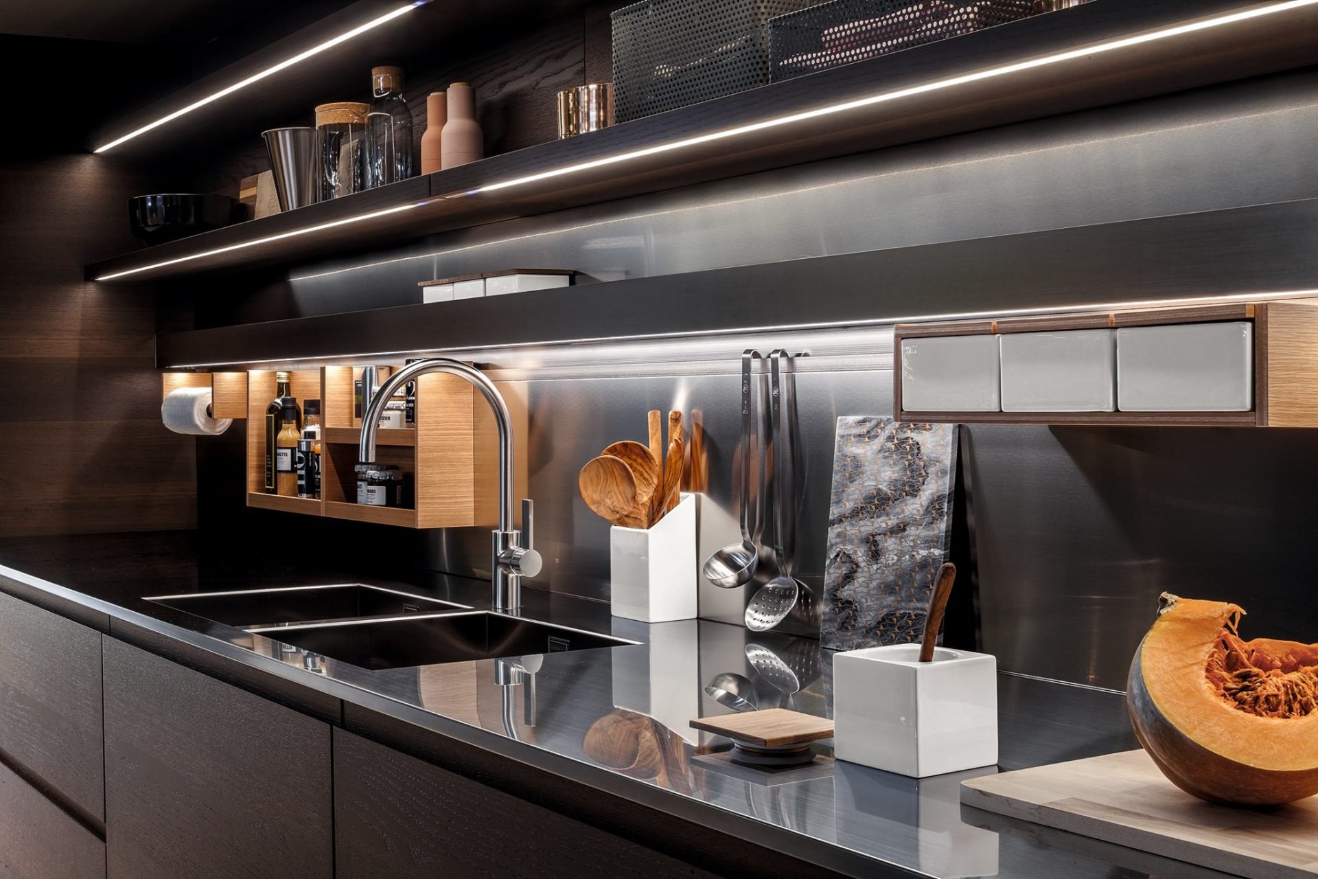 I nuovi cassetti in alluminio, con guide ad estrazione totale, sono dotati di un inedito sistema di apertura push e rientro ammortizzato.