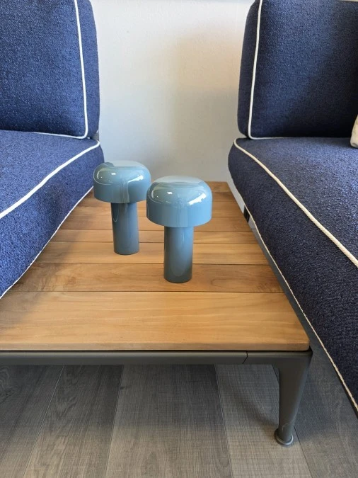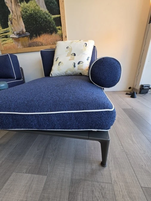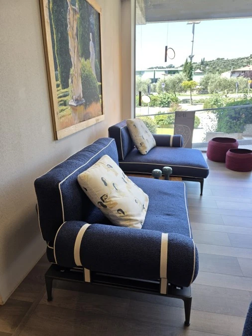 Realizzato con fibre di poliestere riciclate da PET e fodere idrorepellenti, Ribes unisce design, sostenibilità e durata nel tempo. La finitura Blue ne valorizza l’eleganza contemporanea.