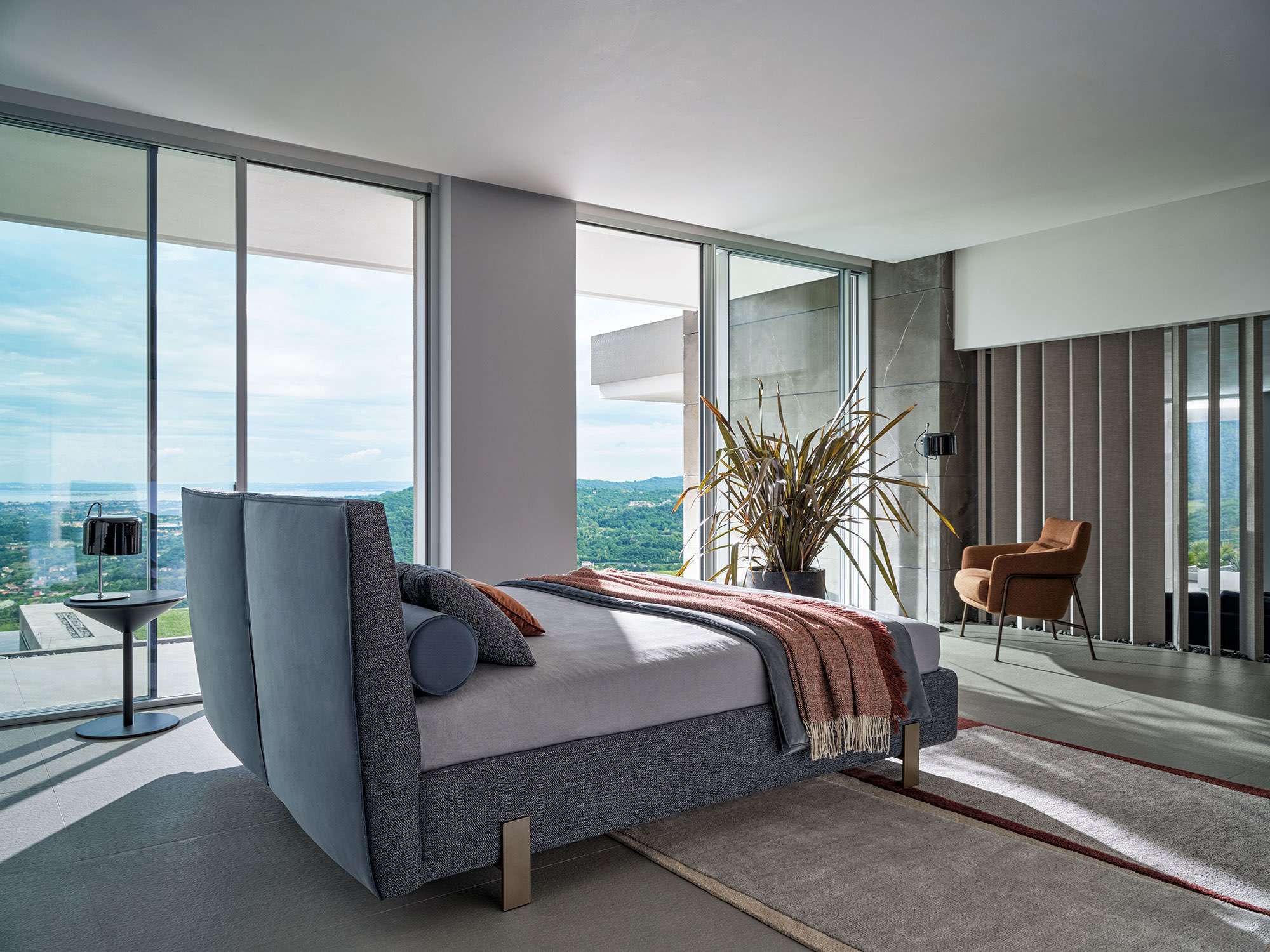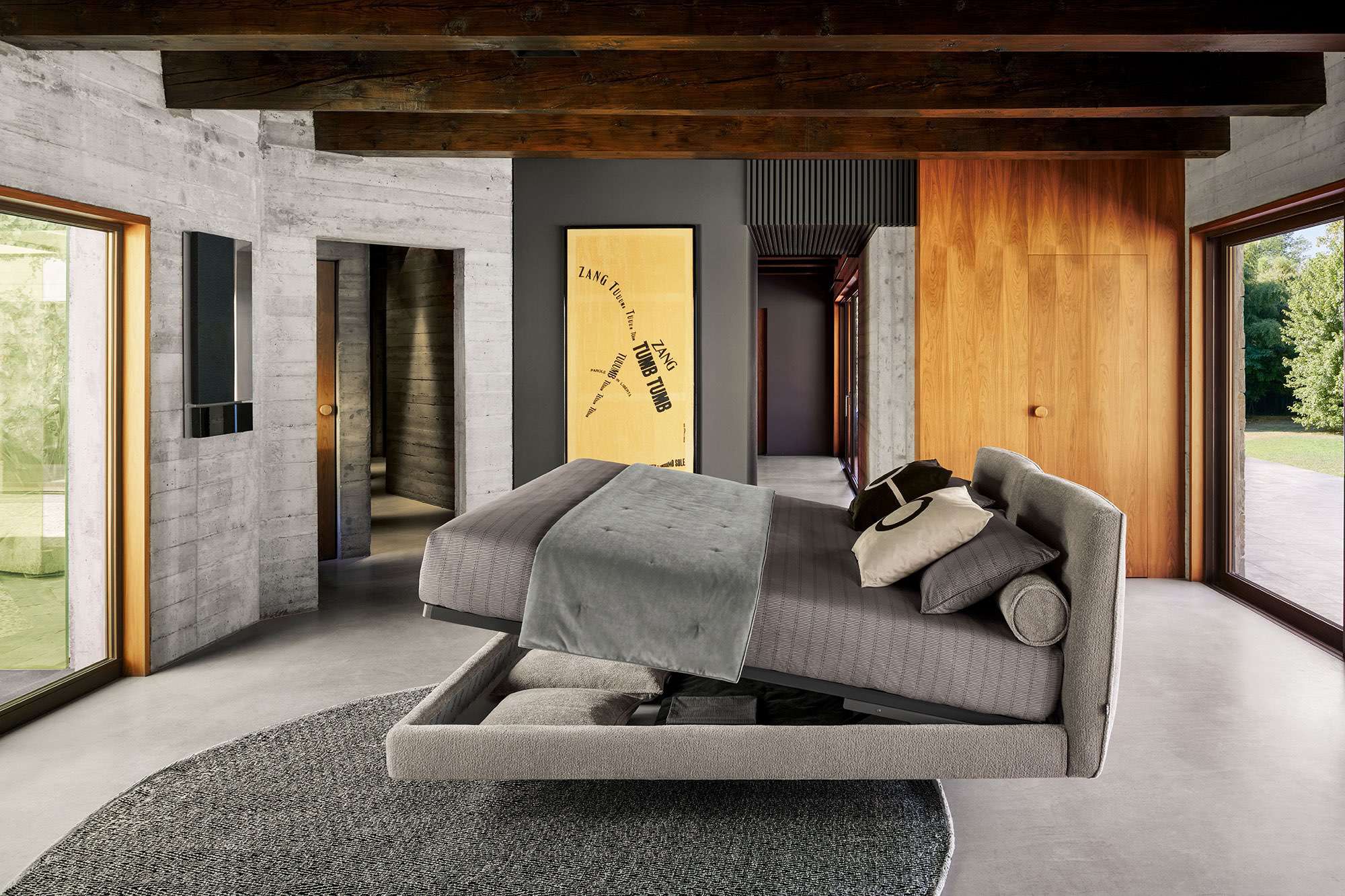 Book è un letto che prende ispirazione dalla forma di un libro aperto, pronto da leggere. La sua ampia testiera imbottita richiama la sagoma di un volume appoggiato su un tavolo e offre un sostegno comodo e corretto per chi ama concedersi un momento di lettura serale. L’effetto finale è accogliente, rilassante, con un equilibrio perfetto tra forma e funzione.