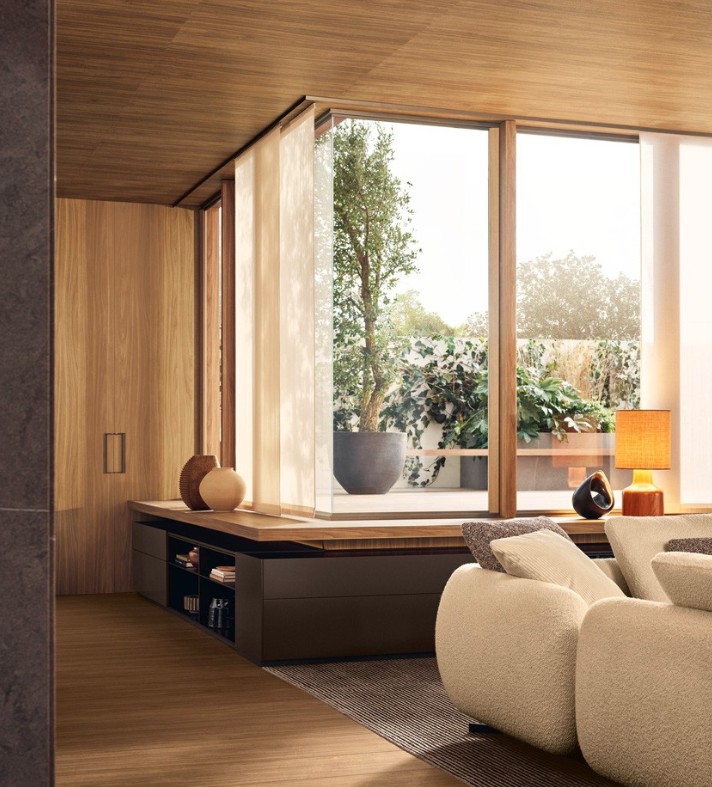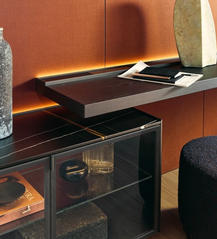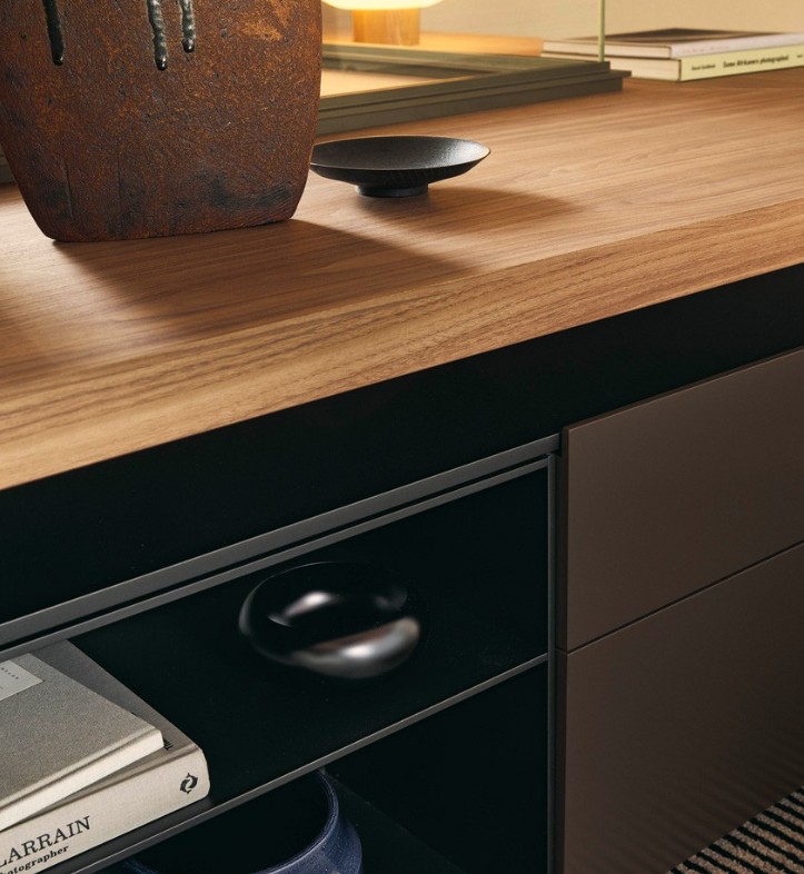 A completare e ampliare la gamma, una collezione di madie modulari che consente di configurare ogni pezzo in base alle proprie esigenze estetiche e funzionali, scegliendo liberamente tra vani a giorno, vetrine, cassetti, ante battenti o a ribalta. Ogni elemento dialoga con gli altri in un gioco di pieni e vuoti, di trasparenze e volumi, che consente di progettare soluzioni su misura per ogni spazio.