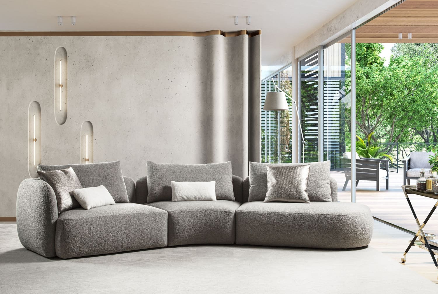 Il rivestimento in tessuto è completamente sfoderabile, pensato per la massima praticità nella manutenzione quotidiana. I piedi a scomparsa, in ABS nero con inserto antiscivolo, mantengono il divano leggero e visivamente sospeso, contribuendo all’equilibrio di una linea elegante ma disinvolta.