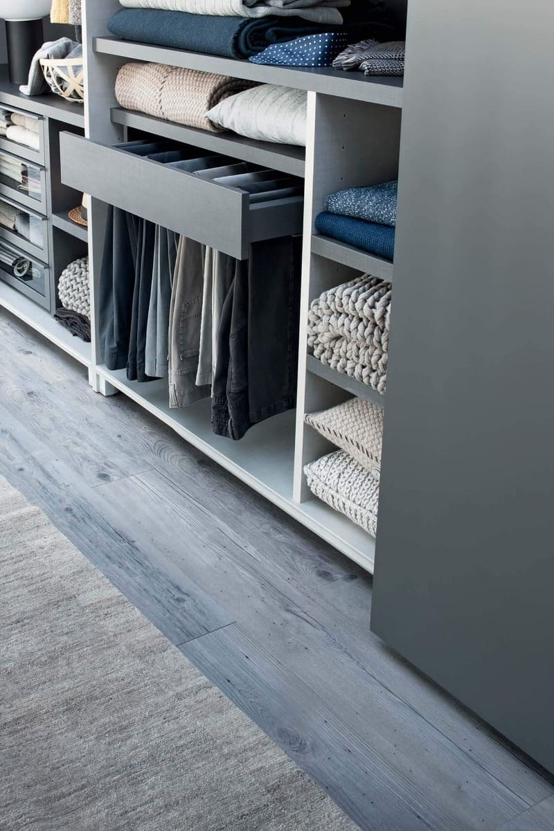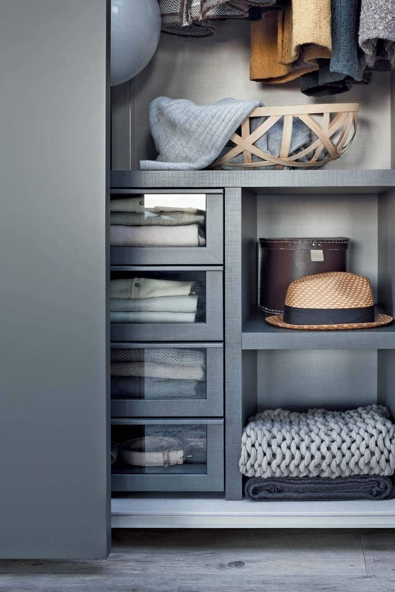 Le possibilità di personalizzazione degli interni sono altrettanto ampie: il programma Armadio al Centimetro propone diverse finiture a catalogo e una ricca gamma di attrezzature funzionali per razionalizzare lo spazio in base alle esigenze specifiche. Cassettiere, porta pantaloni, porta cinture, porta scarpe, ripiani e barre appendiabiti con luce integrata. Non mancano dettagli preziosi in cuoio e tessuto, come tappetini per i cassetti e scatole dedicate ai vani porta camicie, per un risultato elegante, pratico e completamente su misura.