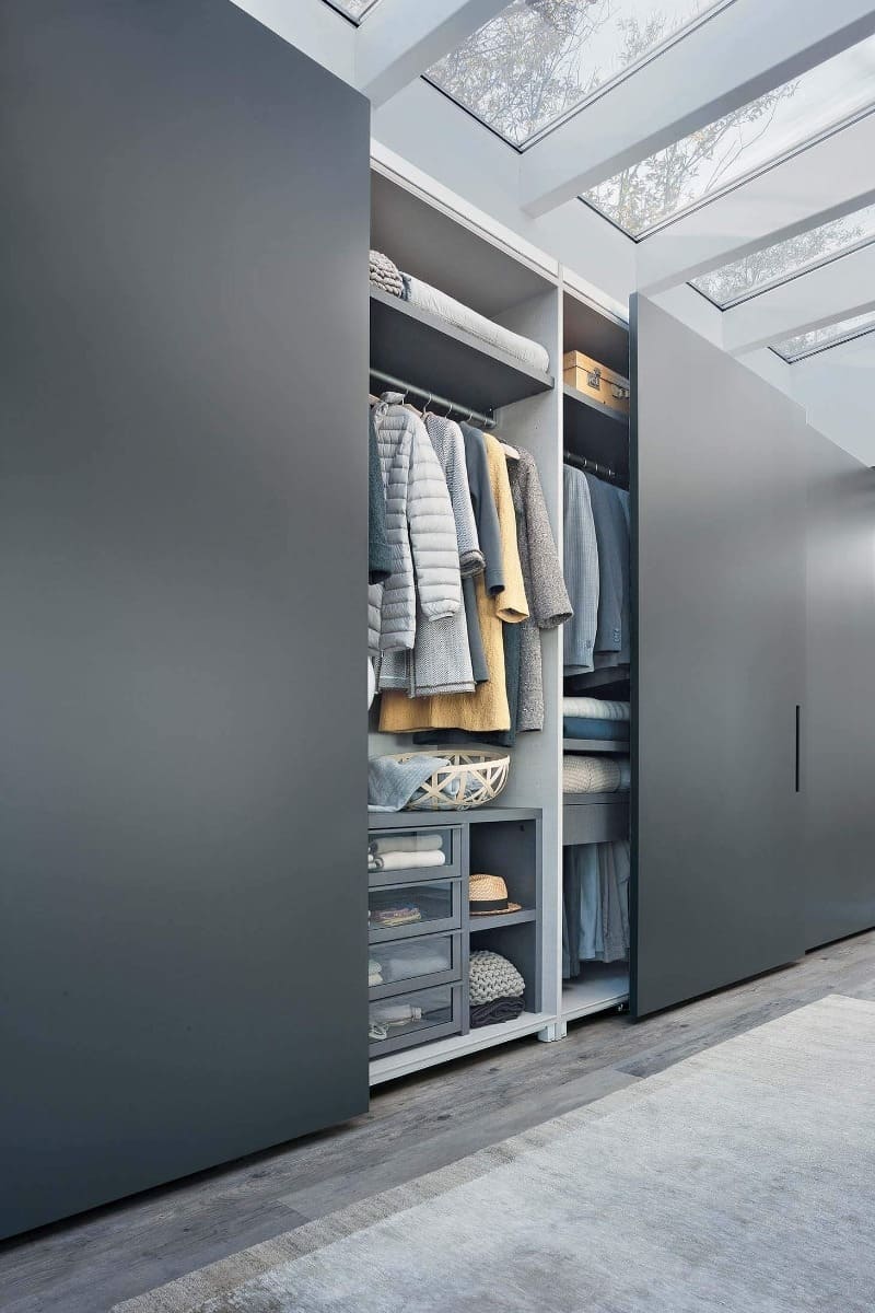 Il sofisticato sistema di apertura a compasso permette di allineare le ante complanari su un unico piano, garantendo una superficie perfettamente continua, priva di sporgenze e rientranze, per un effetto estetico armonioso e moderno.