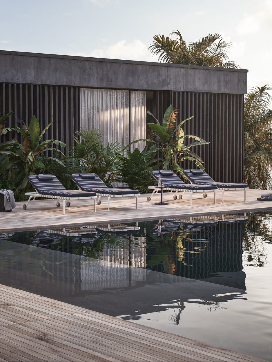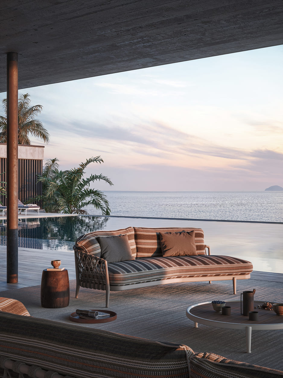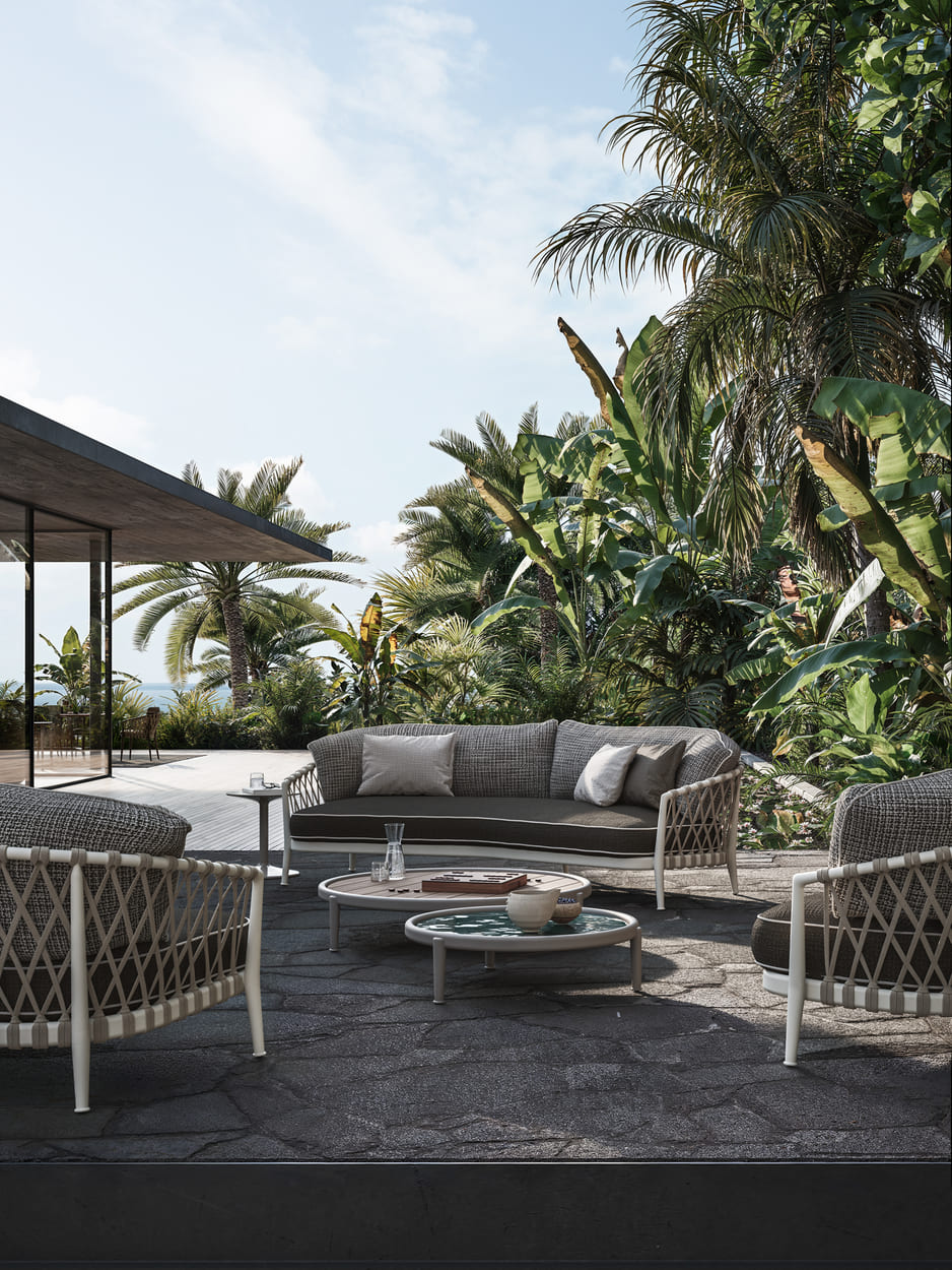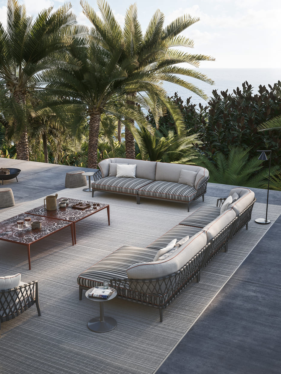 Tutti gli elementi condividono una struttura in alluminio verniciato a polvere, intrecci in nastri di polipropilene per esterni e un piede dal design continuo ed elegante. I cuscini, con profilo decorativo, offrono comfort e naturale morbidezza. La palette di colori, raffinata e versatile, permette infinite combinazioni tra strutture, intrecci e rivestimenti, per un arredo outdoor su misura.