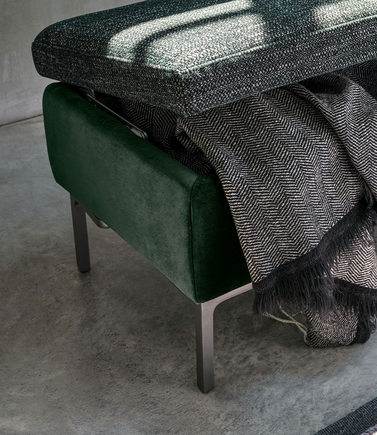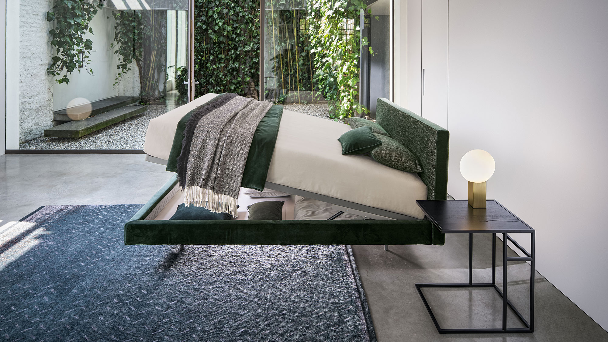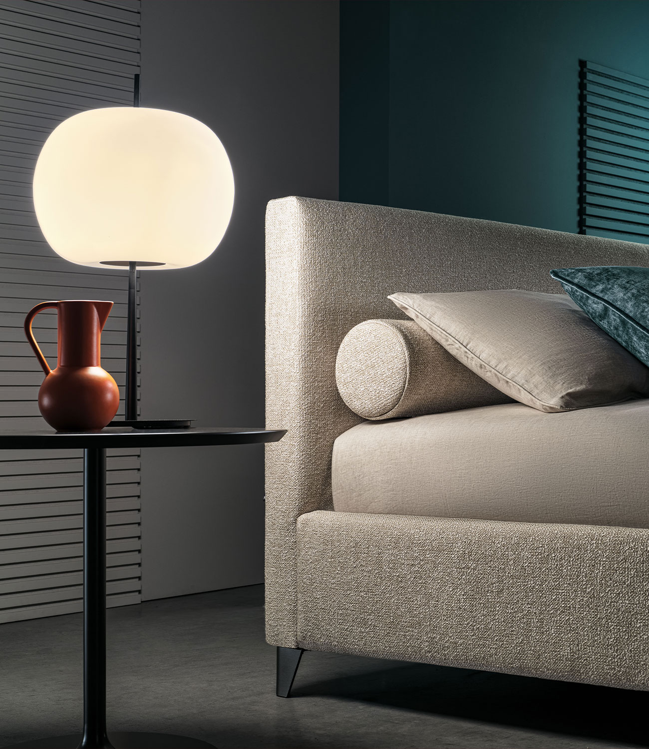 Max è un letto che unisce solidità visiva e comfort avvolgente, una presenza importante nella camera che reinterpreta in chiave attuale l’archetipo del letto imbottito. Le proporzioni generose del giroletto, che quasi si fondono con il pavimento, trasmettono una sensazione di stabilità e protezione, come un’isola su cui potersi adagiare, dimenticando il mondo esterno.