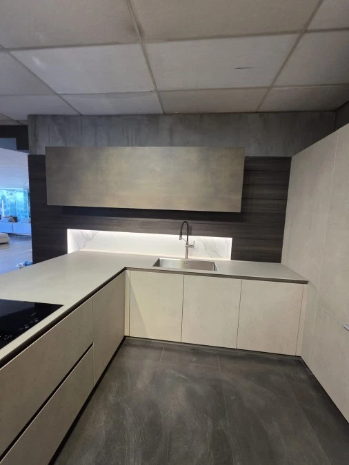 Caratteristiche principali Ante: melaminico argilla Top: laminato Gole: alluminio bronzo Zoccolo: alluminio rivestito Accessori: piano snack in eucalipto, piano estraibile in acciaio
