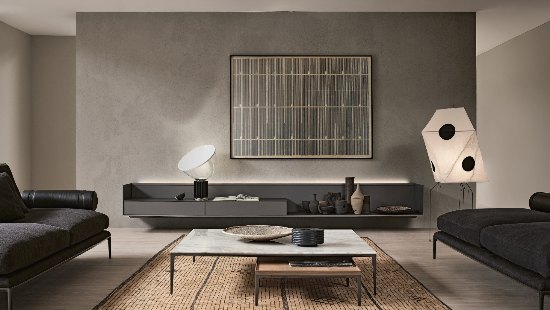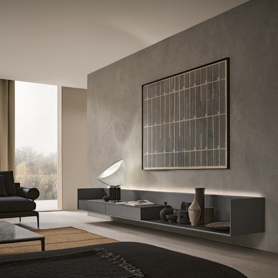 Nella configurazione mobile living, la struttura in alluminio accoglie moduli con cassetti, ante a ribalta o vani a giorno, dotata di passacavi per un pratico alloggiamento TV. La modularità orizzontale prevede profondità fissa di 525 mm e lunghezze da 1616 a 3856 mm.