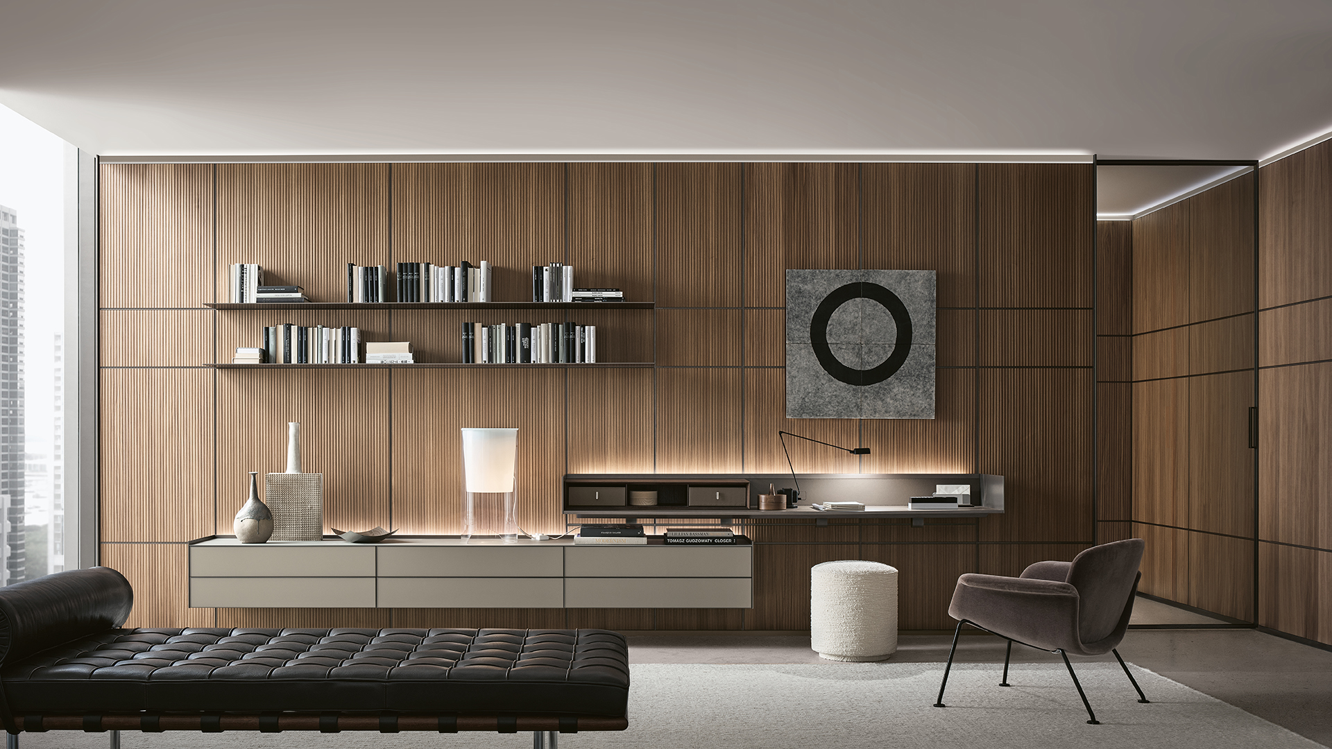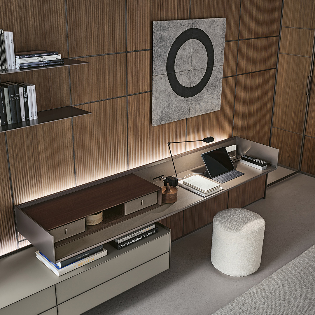 Self Plan è un sistema di composizioni sospese, applicabili direttamente a parete o integrabili alla boiserie Modulor. Disponibile in versione scrittoio o mobile living, si distingue per la leggerezza visiva e la libertà compositiva, grazie a piani sospesi su cui disporre contenitori dedicati.