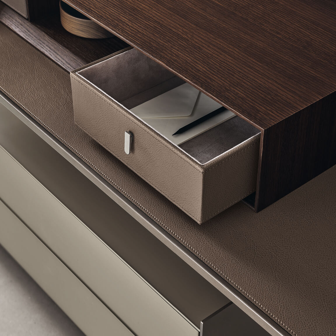La struttura in alluminio è disponibile in 46 colori Ecolorsystem, mentre nella versione scrittoio il piano e l’alzata posteriore si realizzano in vetro o similpelle, per un totale di 106 finiture. Completa la proposta un’illuminazione LED superiore opzionale.