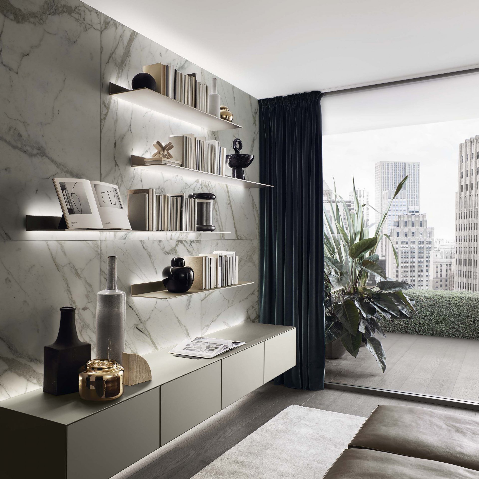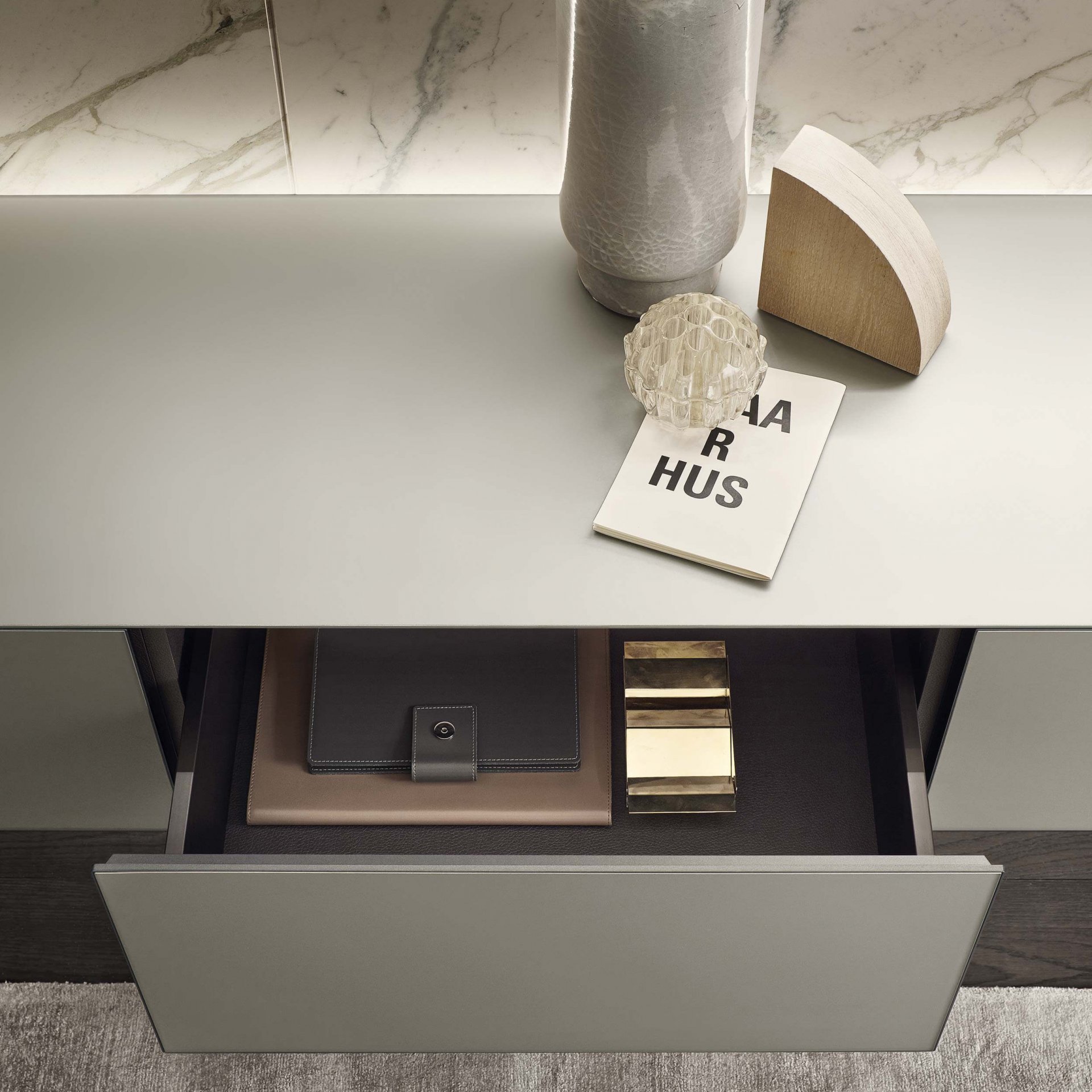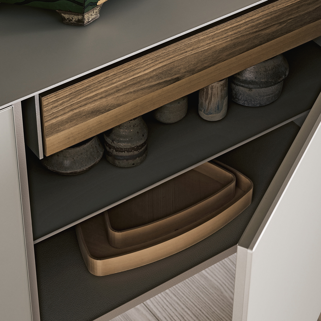 Self si distingue non solo per la sua ampia varietà compositiva, ma anche per i suoi dettagli esclusivi. I cassetti sospesi in essenza, con interni rivestiti in similpelle, aggiungono un tocco di eleganza, mentre la retroilluminazione LED ad alta efficienza luminosa rappresenta una novità importante. Questa tecnologia rispetta le normative europee ERP-Ecodesign, garantendo un’illuminazione ecologica e prestazioni superiori. Disponibile per il sistema Self, Self Plan e mensole Eos, la retroilluminazione LED assicura una luce delicata e funzionale. Il sistema è inoltre dotato di un profilo di aggancio a parete che consente la creazione di composizioni sospese e prevede un’illuminazione integrata, aggiungendo un ulteriore livello di sofisticazione alle composizioni.
