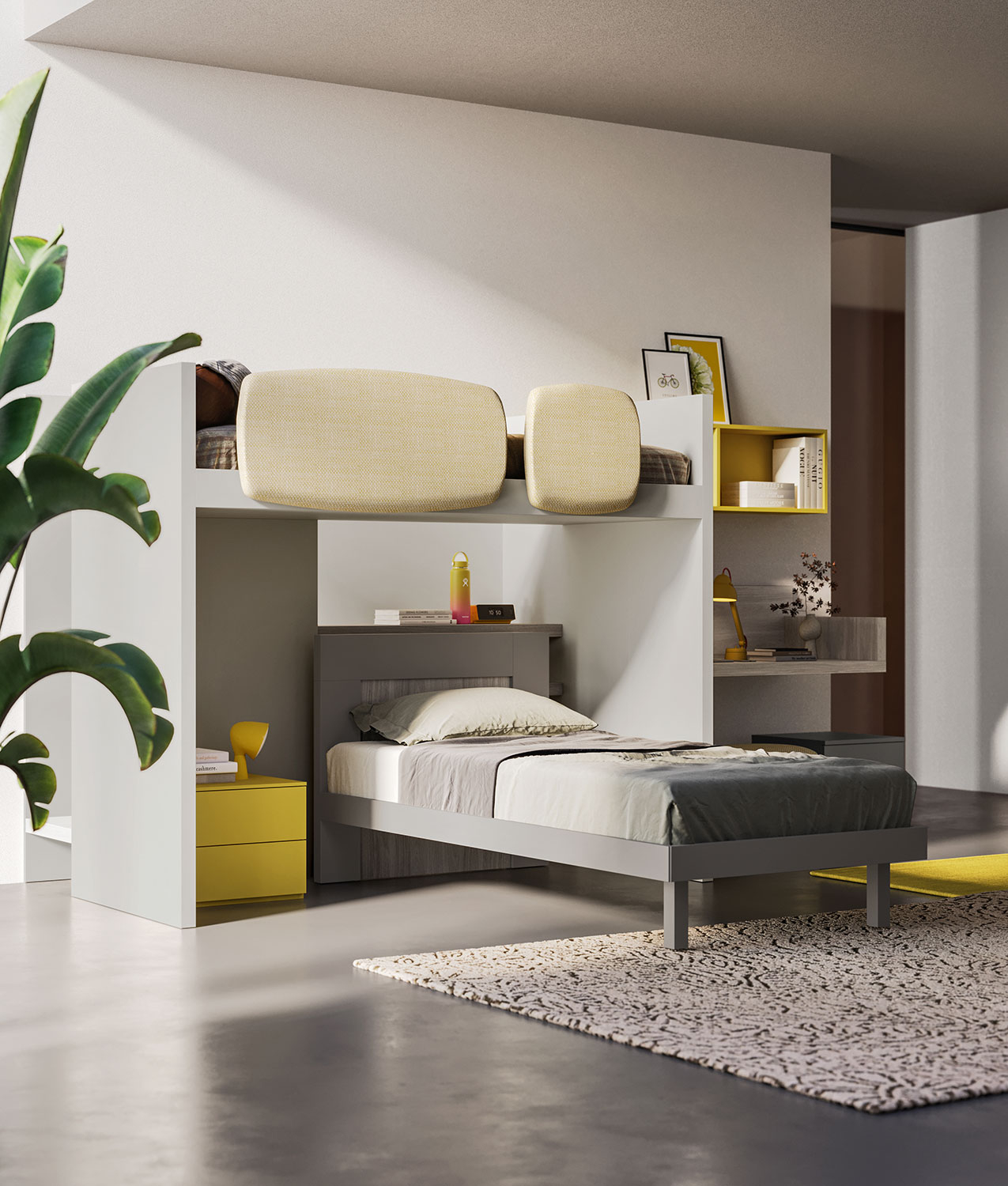 Start S23 è una cameretta a soppalco pensata per due bambini, gemelli o di età diverse, con due letti singoli disposti a L, un angolo studio e un ampio guardaroba. Progettata per essere altamente personalizzabile in dimensioni, colori, finiture e disposizione degli elementi, questa soluzione ottimizza lo spazio, offrendo tutto il necessario per dormire, studiare e contenere. Il cuore della composizione è Sky, un letto a soppalco che può anche essere utilizzato come castello, con letti sfalsati perpendicolari. Il letto superiore è accessibile tramite una scaletta posteriore con mensole-gradini e include sponde anticaduta imbottite. Il letto inferiore, che può essere sia a terra che in versione 120 cm per un comfort maggiore, offre diverse configurazioni per adattarsi a diverse esigenze, come l’aggiunta di letti a cassettoni estraibili o uno scrittoio sotto il soppalco.