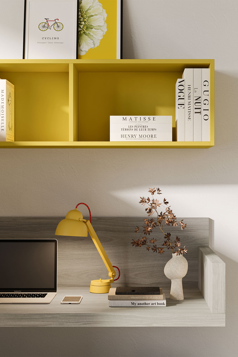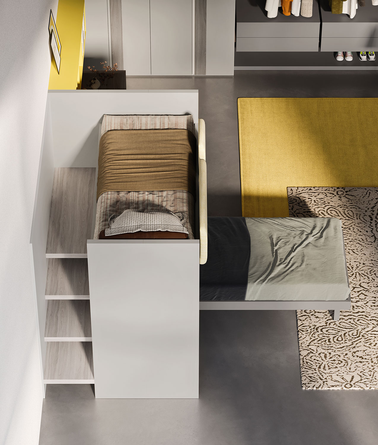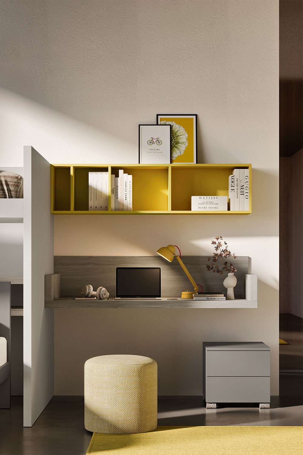 La zona studio è collocata accanto al soppalco e sfrutta al massimo lo spazio disponibile. Un scrittoio sospeso, una mensola contenitore a 4 vani, una cassettiera su ruote e un pouf creano un angolo funzionale dove i bambini o adolescenti possono studiare, giocare o seguire lezioni online in tranquillità. La zona guardaroba è composta da un armadio a 4 ante battenti abbinato a una cabina armadio a vista, con montanti e cassetti sospesi. Questa combinazione di spazi chiusi e aperti offre sia una soluzione estetica dinamica che una grande funzionalità: l’armadio può contenere abiti fuori stagione, mentre la cabina a giorno permette di tenere a portata di mano i vestiti e gli accessori quotidiani. Ogni elemento della cameretta è progettato per essere modulare e facilmente adattabile alle esigenze in continua evoluzione dei bambini o adolescenti.