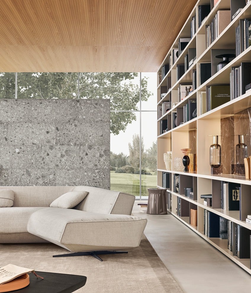 Wall System si arricchisce di numerosi elementi che ampliano la funzionalità del sistema, come ante battenti, scorrevoli o a ribalta, ideali per creare angoli bar o spazi dedicati all’home office. Le vetrine e le teche permettono di esporre oggetti e opere d’arte, mentre i cassetti e i portali TV aggiungono ulteriore praticità. La varietà di finiture disponibili, tra cui il marmo pregiato, consente di personalizzare ogni composizione, dando vita a soluzioni uniche che rispecchiano perfettamente lo stile e la personalità di ogni ambiente.