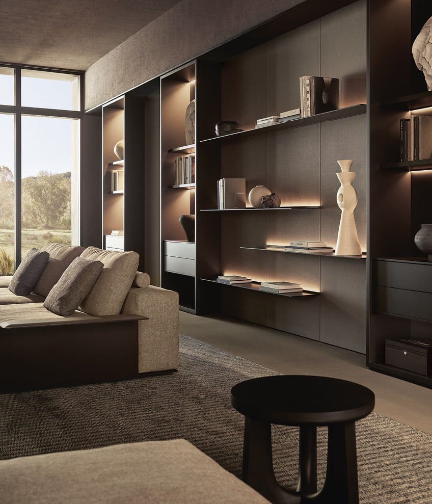 Wall System di Poliform è un sistema di arredo storico, noto per la sua straordinaria versatilità e la capacità di adattarsi ad ogni esigenza funzionale ed estetica del living. Il programma ruota attorno alla libreria, concepita come il cuore pulsante della zona giorno, e si evolve costantemente per offrire soluzioni sempre nuove. La struttura è basata su una libreria a spalla portante, alleggerita da griglie sottili che creano una sensazione di leggerezza e modernità.