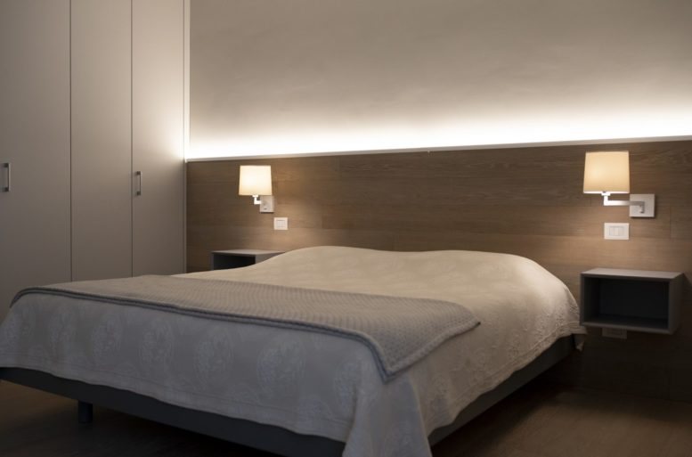 La porta a scomparsa in vero color bronzo ci separa dalla zona notte attraverso un vedo non vedo ed una continuità dettata dal passo delle luci nel controsoffitto, che ci conducono nella zona più privata della casa; anche qui c’è una continuità di materiali e forme semplici scandite da una illuminazione rigorosa e di bella atmosfera studiata in collaborazione con la ditta Forme di Luce di Verona.