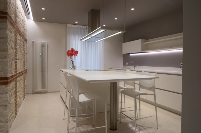 All’ingresso dell’abitazione si trova un ampio spazio, che, attraverso dei pieni e dei vuoti ci permette di capire fin da subito quali saranno le forme e le linee che ci aspettano nell’esplorare la casa. Dall’ingresso si passa nell’ampia cucina ben illuminata, dove domina un bancone centrale di lavoro integrato con un’area dove sostare e mangiare velocemente, dalla cucina la sala da pranzo è adiacente e ben visibile per permettere la socializzazione con i commensali.