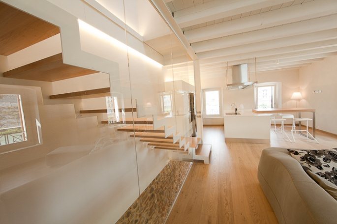 La quasi monocromia degli spazi e i pochi materiali usati (legno per il pavimento, intonaco e tinteggiatura a calce, travi del solaio, porte e opere in ferro laccate bianche) scandiscono i ritmi architettonici in modo fluido e naturale, così che lo spazio creato sui tre piani sia apparentemente lo stesso, seppur con funzioni diverse e ben definite.