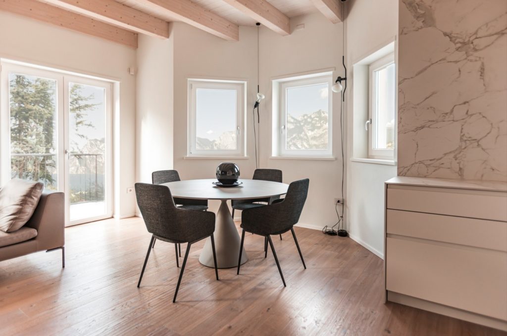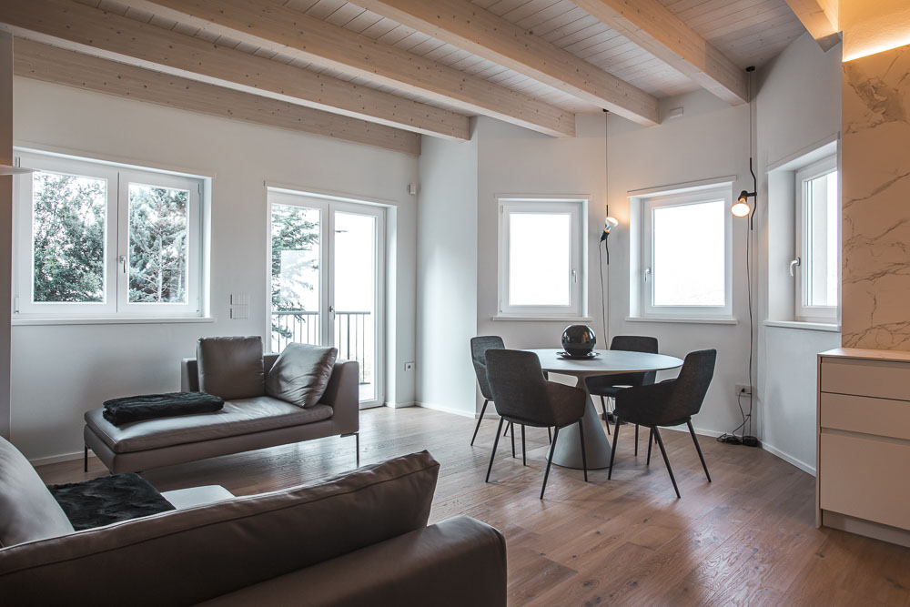 La cucina, realizzata su misura in collaborazione con Modulnova, si distingue per un piano di lavoro in Dekton a “spicchi” che si integra fluidamente con schienali e pareti, creando un effetto di continuità estetica davvero unico. La zona living è accogliente e raffinata: un tavolo Clay di Desalto e le sedie Tusa convivono con divani Charles di B&B in pelle, omaggio al celebre designer Charles Eames, mentre le lampade Parentesi di Flos richiamano l’eleganza degli anni ’60.