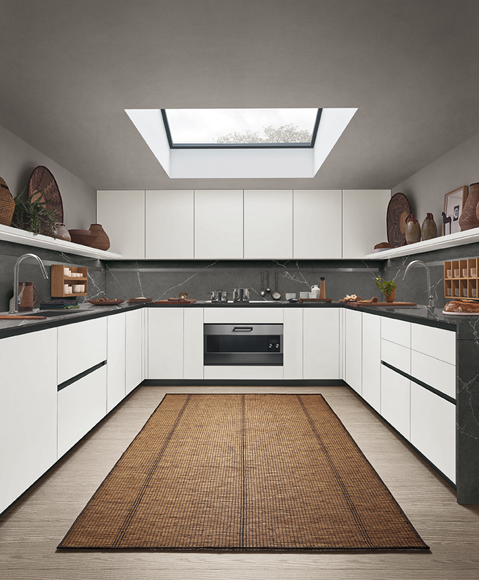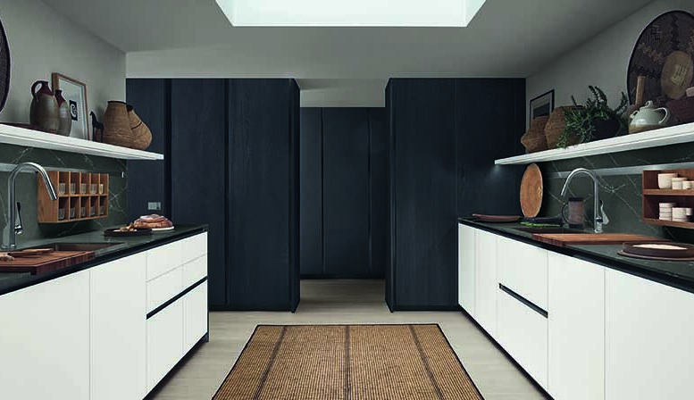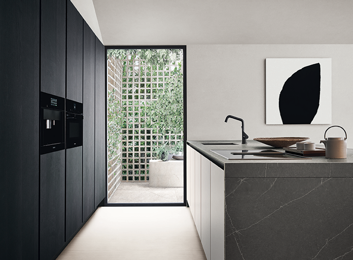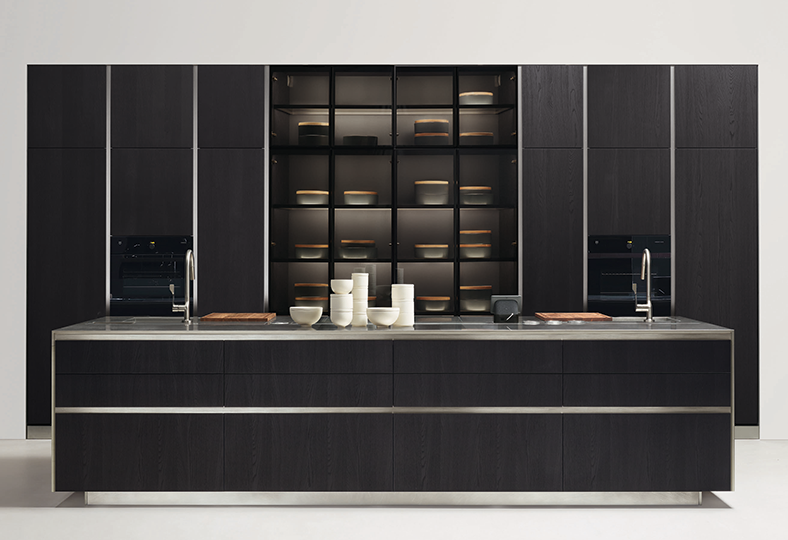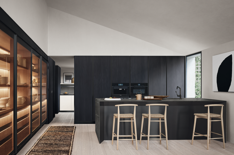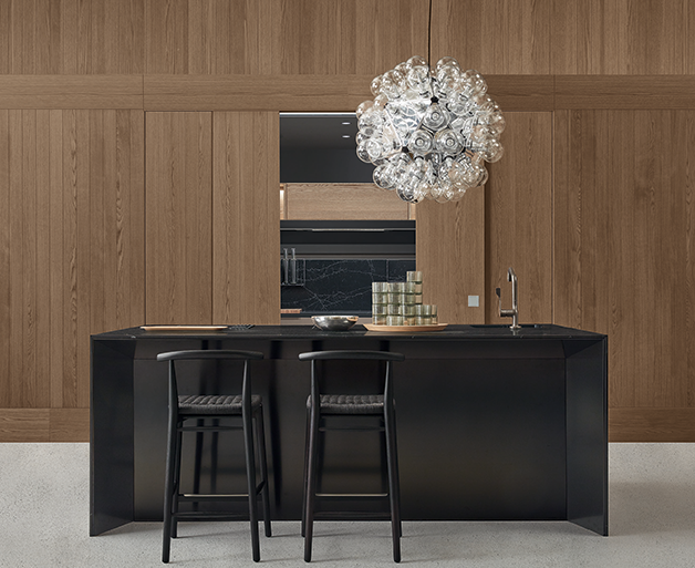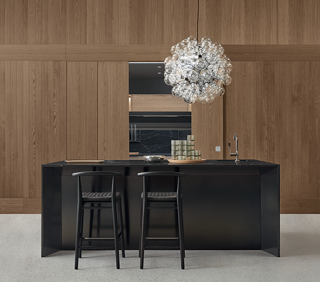 L’architettura, infatti, separa fisicamente e concettualmente la cucina in due ambienti: lo spazio puramente funzionale, la Wet Kitchen, e l’ambiente conviviale, la Show Kitchen. Si realizza così un grande spazio estremamente vivibile, suddiviso dalla parete in legno frassino nero NTF, con una porta complanare integrata nel nuovo Sistema Frame, che funge sia da contenimento che da passaggio tra i due ambiti. Nello stesso tempo, diventa un’elegante boiserie, che esalta l’isola al centro dello spazio.