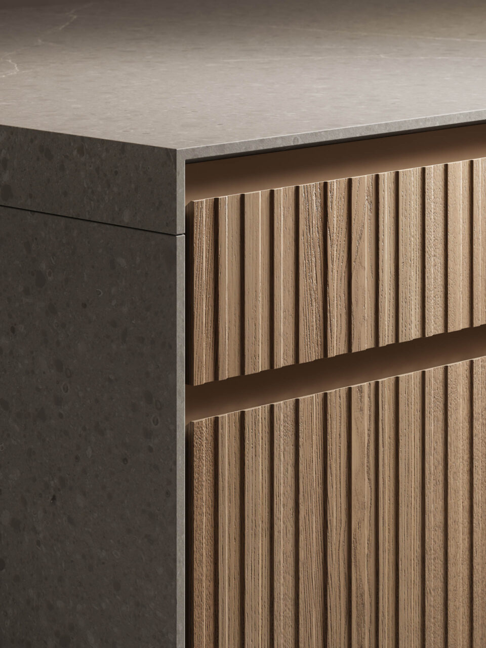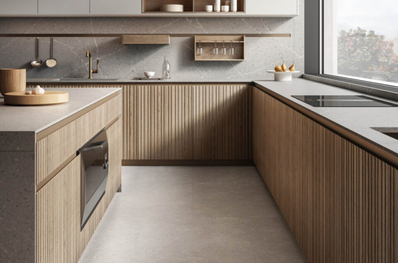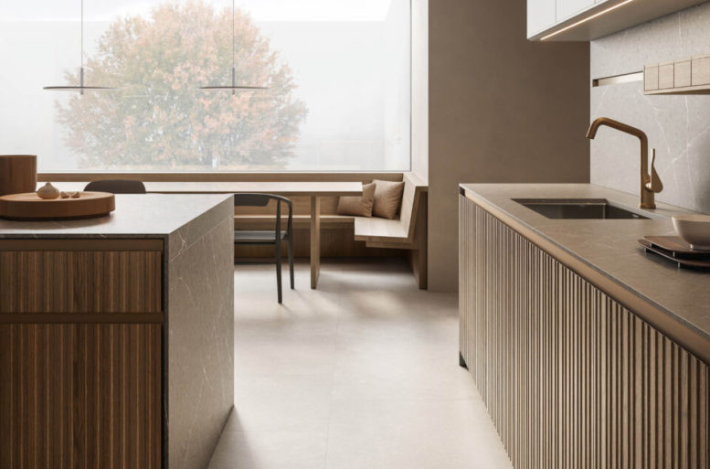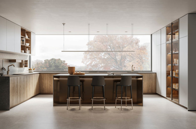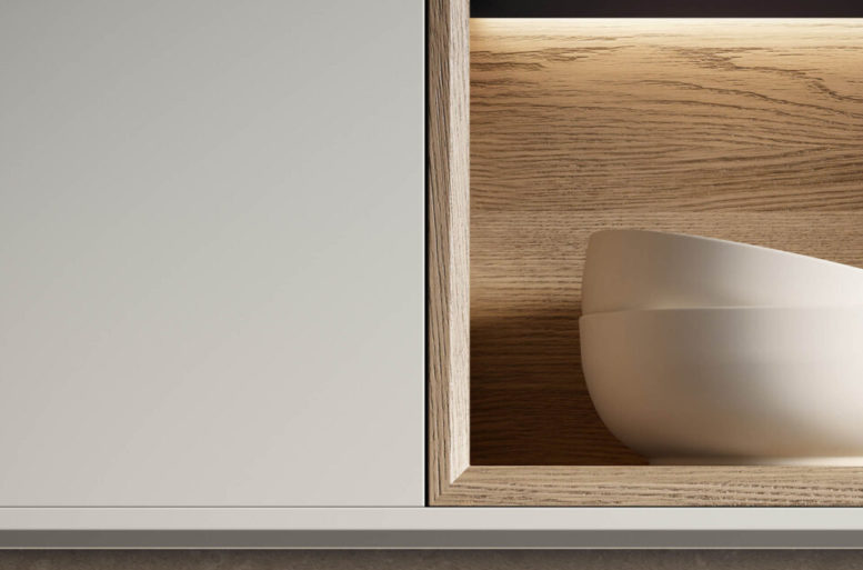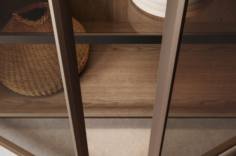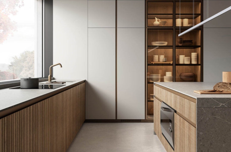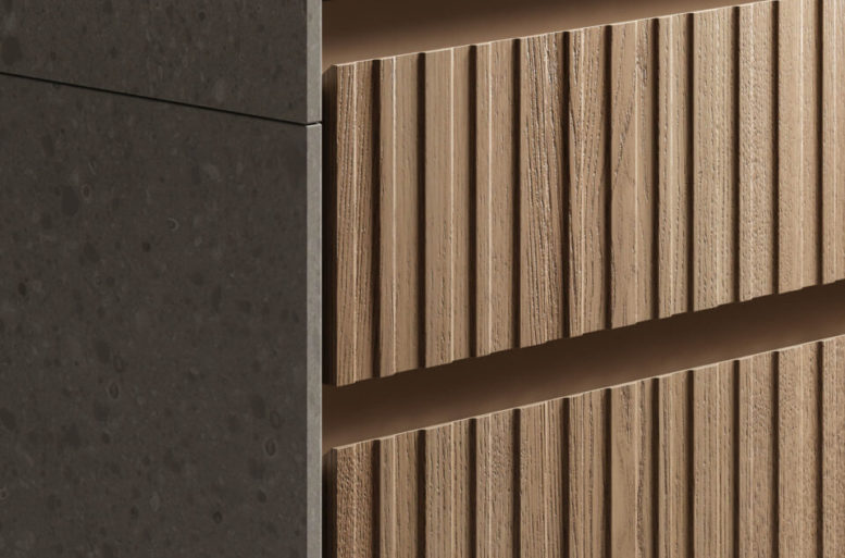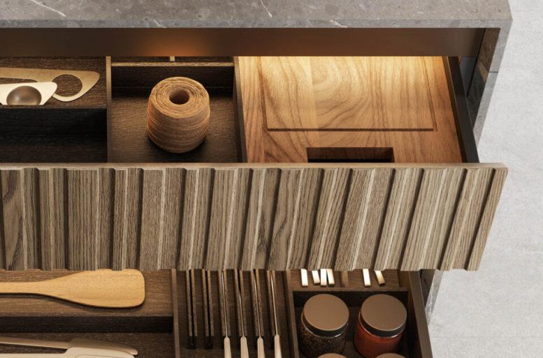 La scelta più distintiva sta nelle ante, che presentano un originale motivo a listelli verticali, in grado di integrare nel loro disegno le linee di separazione tra un contenitore e l’altro, rendendo uniforme la superficie. Ante materiche, preziose, risultato di un processo con un’alta componente artigianale, che nel rincorrersi delle linee verticali giocano con la luce e che al tatto esaltano le qualità del legno naturale. Completa il risultato di grande raffinatezza generale l’accostamento di materiali e finiture scelti per il top, i pensili e le colonne attrezzate.