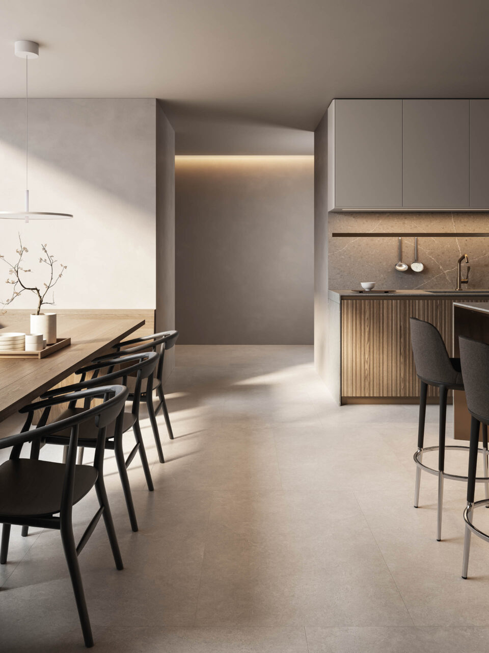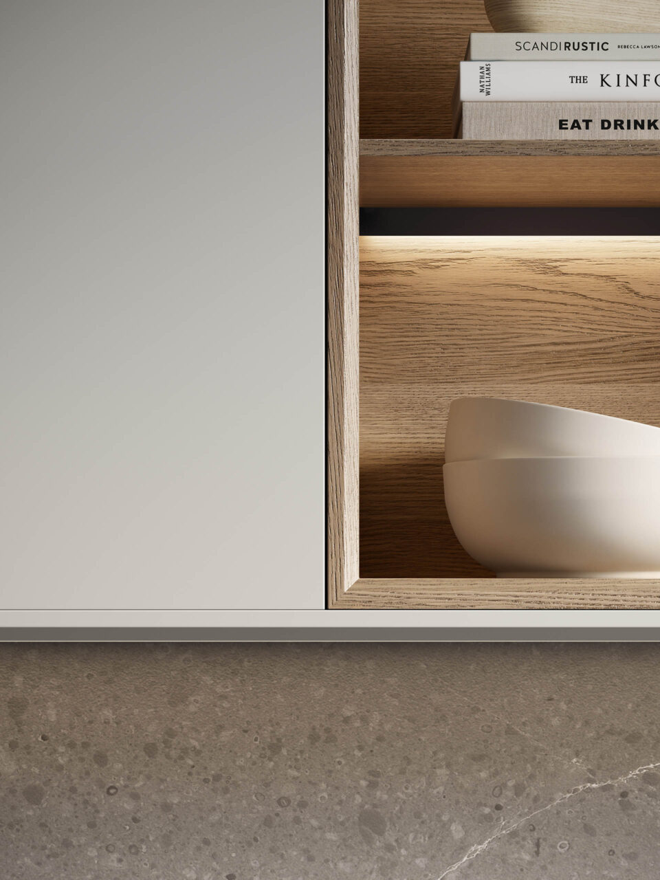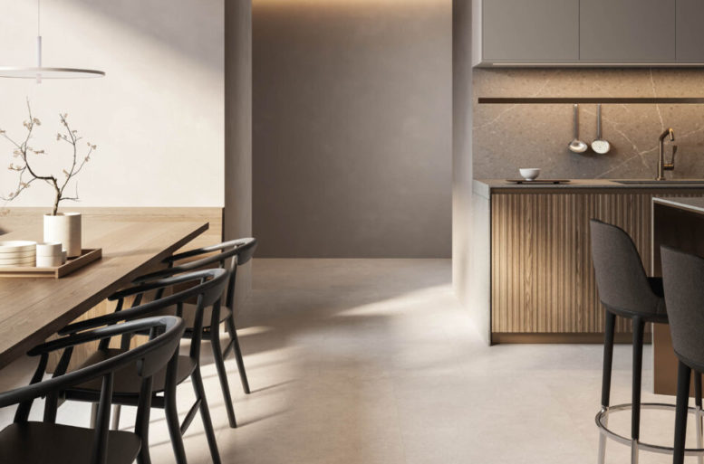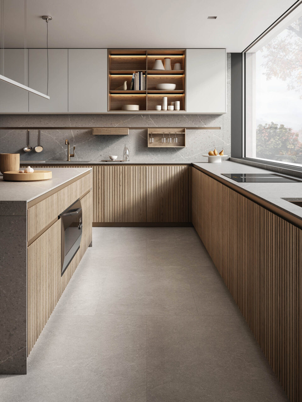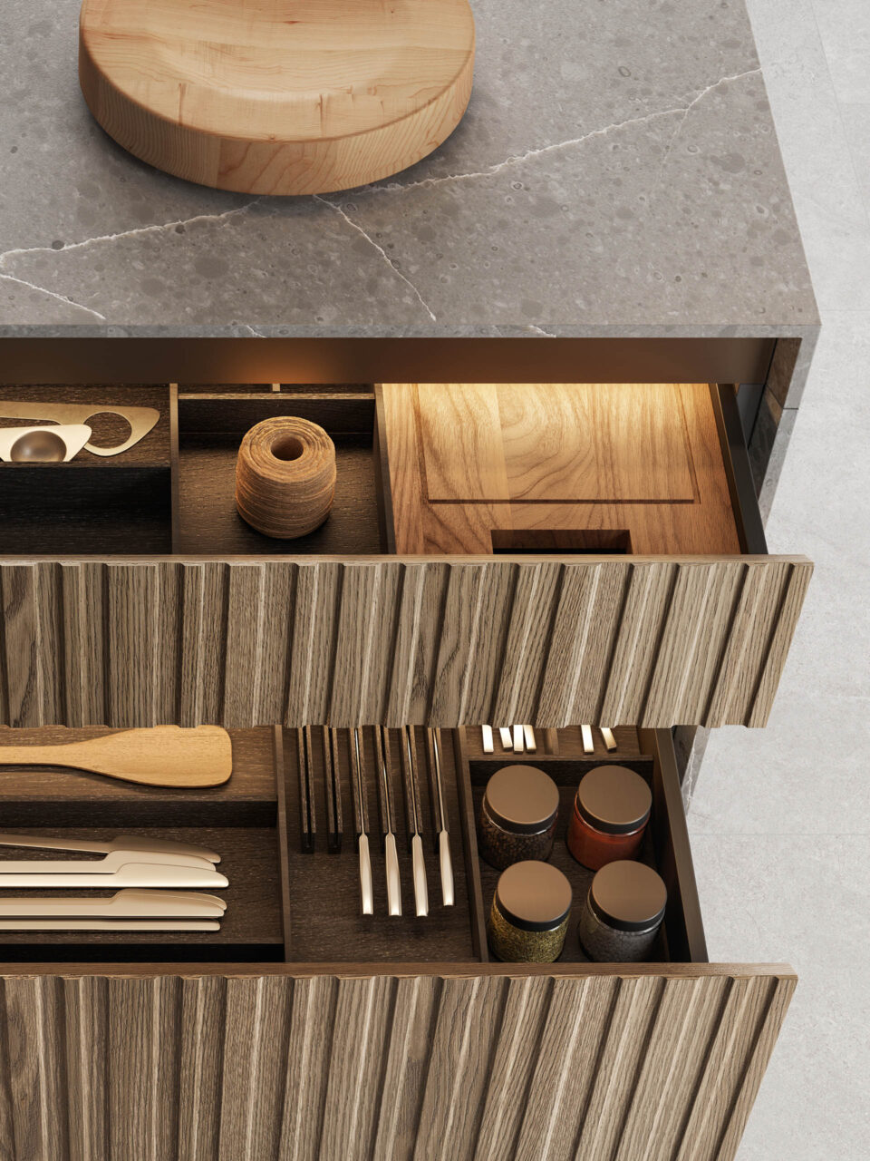 La scelta più distintiva sta nelle ante, che presentano un originale motivo a listelli verticali, in grado di integrare nel loro disegno le linee di separazione tra un contenitore e l’altro, rendendo uniforme la superficie. Ante materiche, preziose, risultato di un processo con un’alta componente artigianale, che nel rincorrersi delle linee verticali giocano con la luce e che al tatto esaltano le qualità del legno naturale. Completa il risultato di grande raffinatezza generale l’accostamento di materiali e finiture scelti per il top, i pensili e le colonne attrezzate.